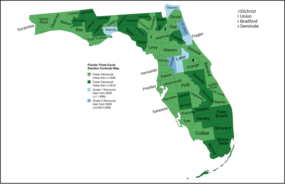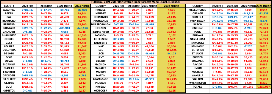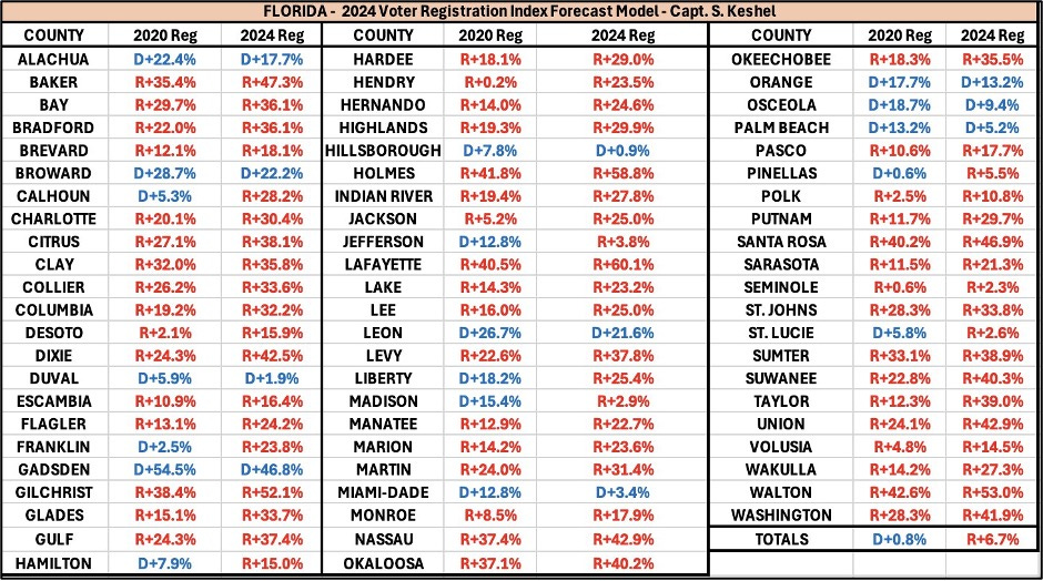 · Party registration shifts since 2020 (67 counties shifted toward the GOP) suggested Trump would improve in all 67 counties. The party registration indicator went a perfect 67 for 67 in Florida, with margins in all 67 more favorable to Trump than in 2020.