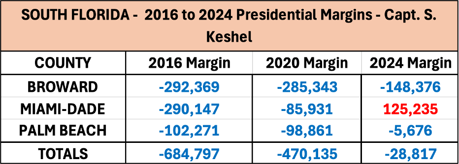· In 2016, Trump lost the three giant South Florida counties of Broward, Miami-Dade, and Palm Beach by a combined margin of 684,797. That number, thanks to his strong performance in Miami-Dade, shrank to 470,135 in 2020. This year, the change was astounding and shows exactly what it takes to turn Florida from a 67-county street fight to a GOP cakewalk.