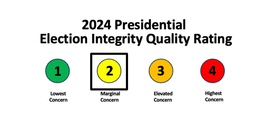 Florida receives a Grade of 2 – Marginal Concern – based primarily on its heavily reliance on mail-in balloting, and because it exceeds the maximum threshold of electoral votes allowable to receive a Grade of 1 – Lowest Concern.