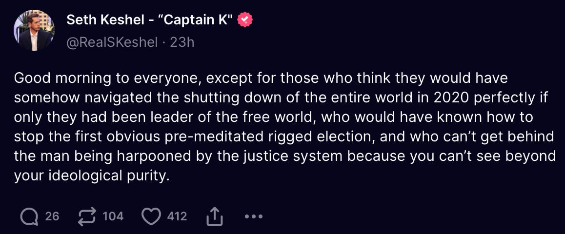 Good morning to everyone, except for those who think they would have somehow navigated the shutting down of the entire world in 2020 perfectly if only they had been leader of the free world, who would have known how to stop the first obvious pre-meditated rigged election, and who can’t get behind the man being harpooned by the justice system because you can’t see beyond your ideological purity.