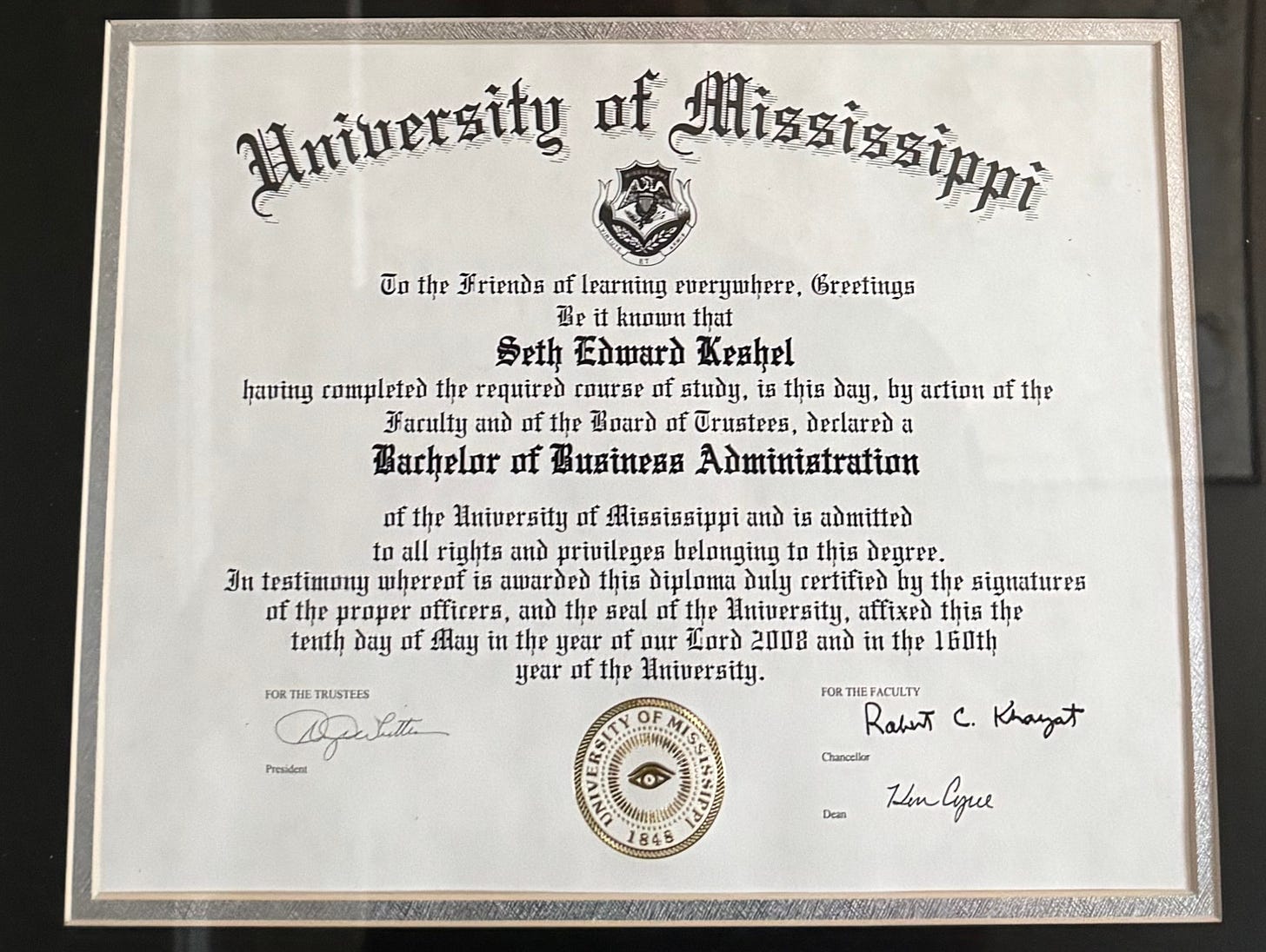 Dr. Cyree is recently retired as Dean of the Ole Miss Business School, and has been a staunch conservative in a sea of leftist academics for decades. He and Lori have been among the loudest voices for activism and citizen engagement in north Mississippi, and have never shied away from these views despite the great risk to Ken’s career. These are the types of people we must admire when it is so easy to blend in and slink away when the fire gets hottest. One of the most surreal connections to this trip has been the memory that when I look at my diploma, Dr. Cyree’s signature sits right there in the bottom right corner: