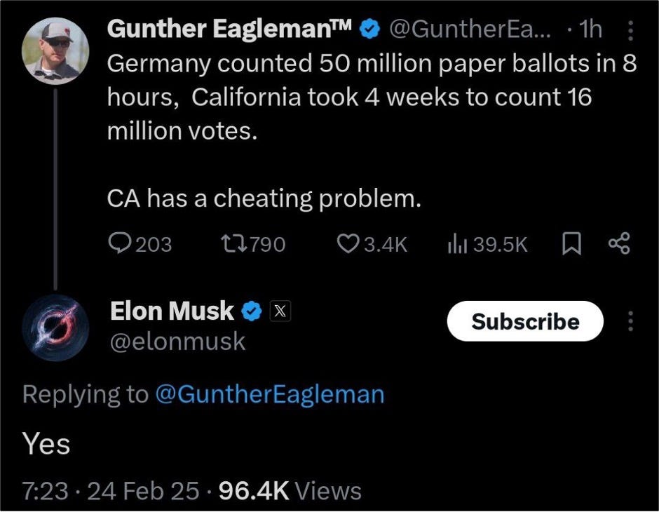 Gunther Eagleman posted the following on X this morning, which received an affirmative “Yes” from Elon Musk as a comment: