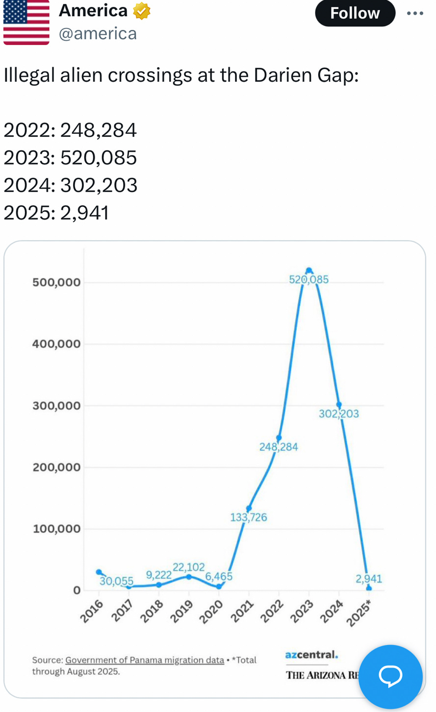What we have now, instead, is the quietest border we’ve had in many decades and a public that no longer needs to hear any political speeches about the border. Take a look at traffic in Panama’s Darien Gap for a stunning visual: