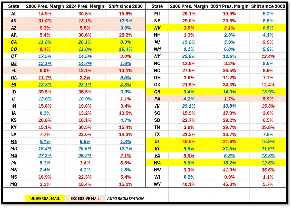 States highlighted in yellow practice Universal Mail-In Voting, in which a mail ballot is automatically sent to every registration on the rolls, whether it belongs to a living, breathing human being or not. All eight of these states are deluged with ballot harvesting, and Harris won 6 of 8 in 2024, 91 electoral votes to 12.