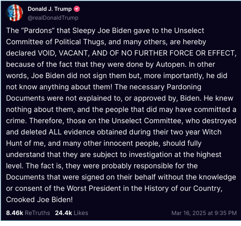 The “Pardons” that Sleepy Joe Biden gave to the Unselect Committee of Political Thugs, and many others, are hereby declared VOID, VACANT, AND OF NO FURTHER FORCE OR EFFECT, because of the fact that they were done by Autopen. In other words, Joe Biden did not sign them but, more importantly, he did not know anything about them! The necessary Pardoning Documents were not explained to, or approved by, Biden. He knew nothing about them, and the people that did may have committed a crime. Therefore, those on the Unselect Committee, who destroyed and deleted ALL evidence obtained during their two year Witch Hunt of me, and many other innocent people, should fully understand that they are subject to investigation at the highest level. The fact is, they were probably responsible for the Documents that were signed on their behalf without the knowledge or consent of the Worst President in the History of our Country, Crooked Joe Biden!