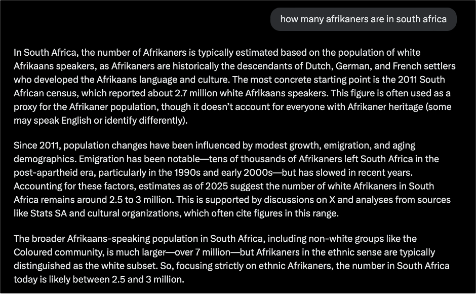 Whites make up 7% of South Africa’s population of 62 million. That puts us at about 4.3 million whites nationwide. Not all white South Africans are Afrikaners; Afrikaners are the descendants of early South African settlers, mostly Dutch - but some French and German – who are associated with control over the nation’s agricultural industry and who control most of South Africa’s farmlands. Grok, X’s A.I. service, estimates between 2.5 and 3.0 million Afrikaners in South Africa:
