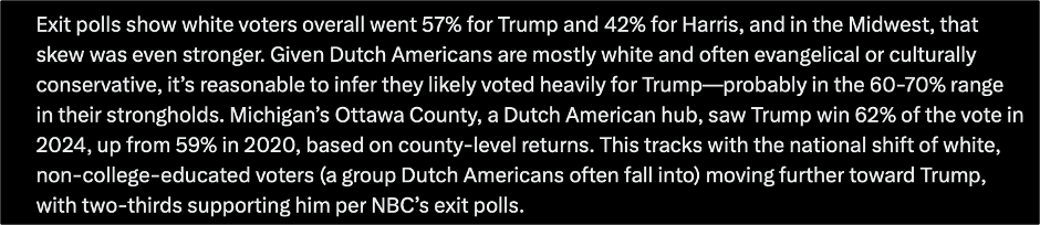 How will they vote? Stat trackers and bean counters don’t do a good job in estimating the vast white vote, largely because they don’t agree on what constitutes it and don’t split for ancestry. Richard Baris is one of the only pollsters I know of who does this, and he expertly explains why Minnesota does this, Pennsylvania does that, and New York does another thing. No one can seem to figure out where people account for the Jewish vote, which pulls everything to the left if it is put into the white vote (not all Jewish Americans identify as white). Here is what Grok said about American voters of Dutch ancestry and their voting in recent elections: