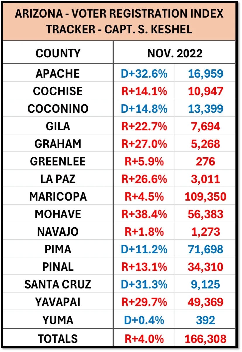 The cheat is baked in to the cake with more than three-quarters of the vote coming by mail. Maricopa County Recorder Justin Heap recently cleared more than 140,000 registrations from the county rolls, which will help, but eventually, the party registration numbers become too dominant for the underdog to win. Check out Democrats in Florida today - within a breath of preventing Ron DeSantis from ever serving as governor in 2018, and now a laughingstock of a party on par with the Colorado Republican Party.
