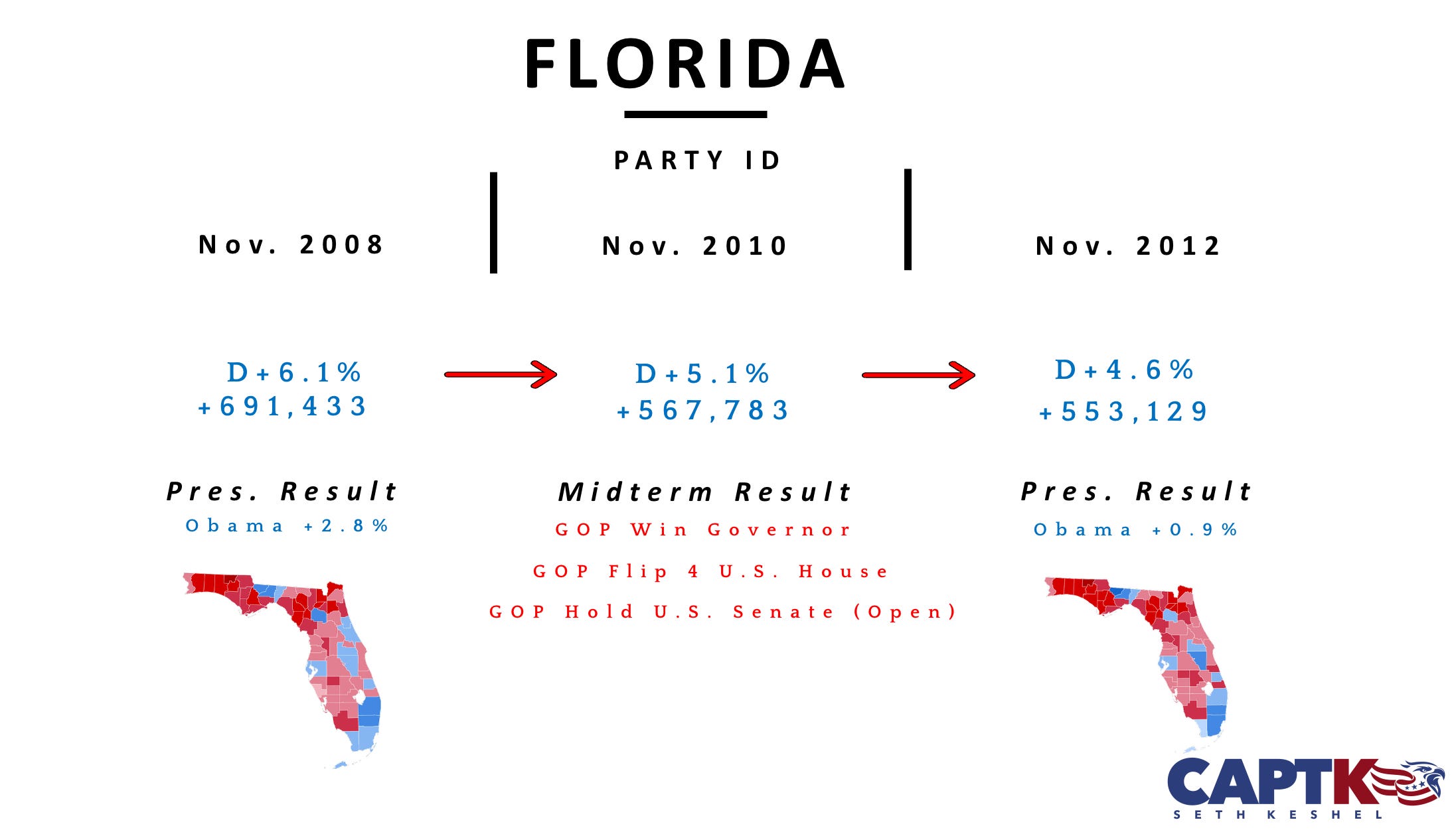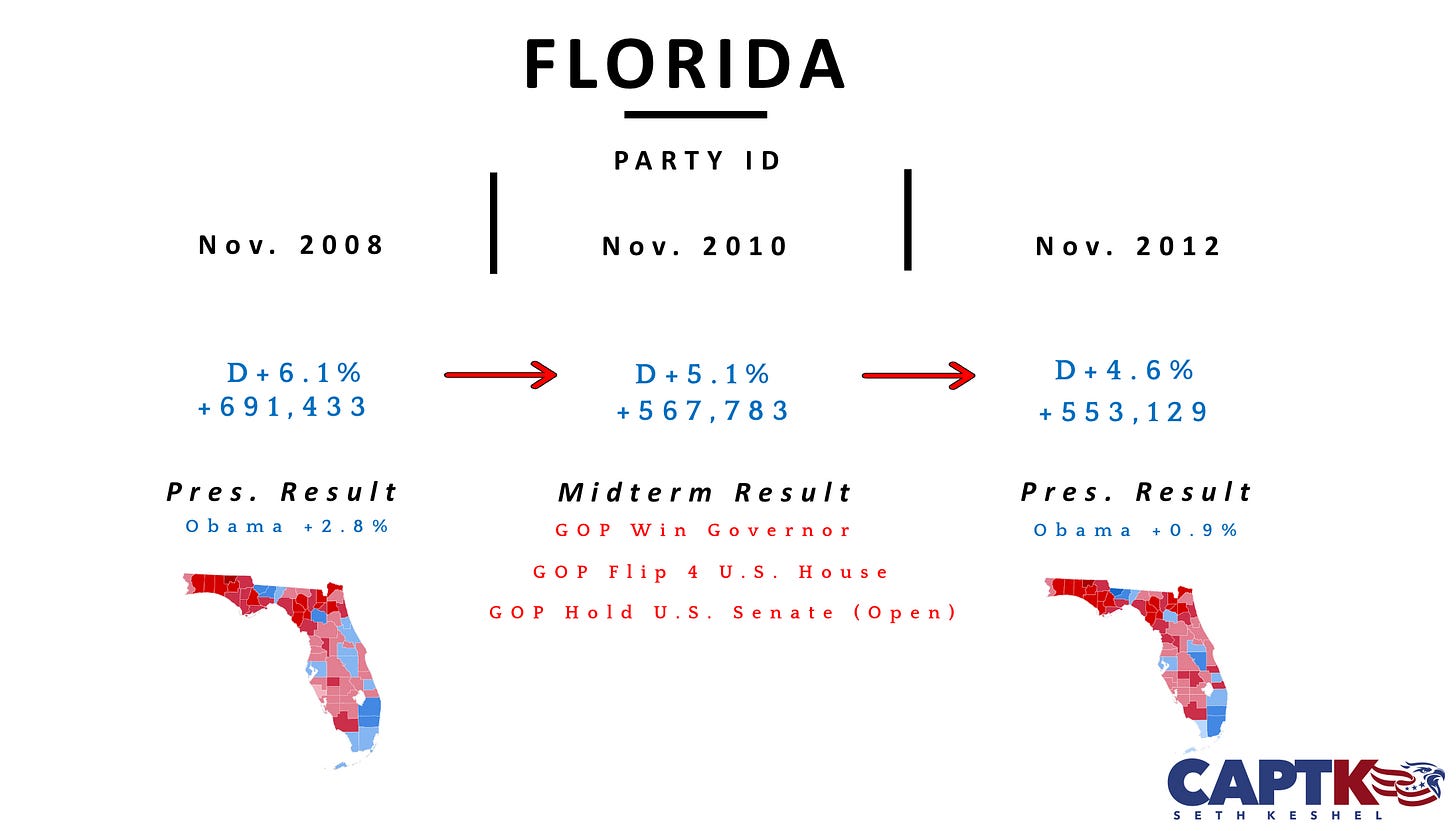 Florida had already moved 133,650 registrations rightward by the time the 2010 midterms rolled around, and the GOP flipped 4 U.S. House seats, got Rick Scott into the Governor’s Mansion, and won the U.S. Senate (Rubio) race when the state was still one of tightest battlegrounds.