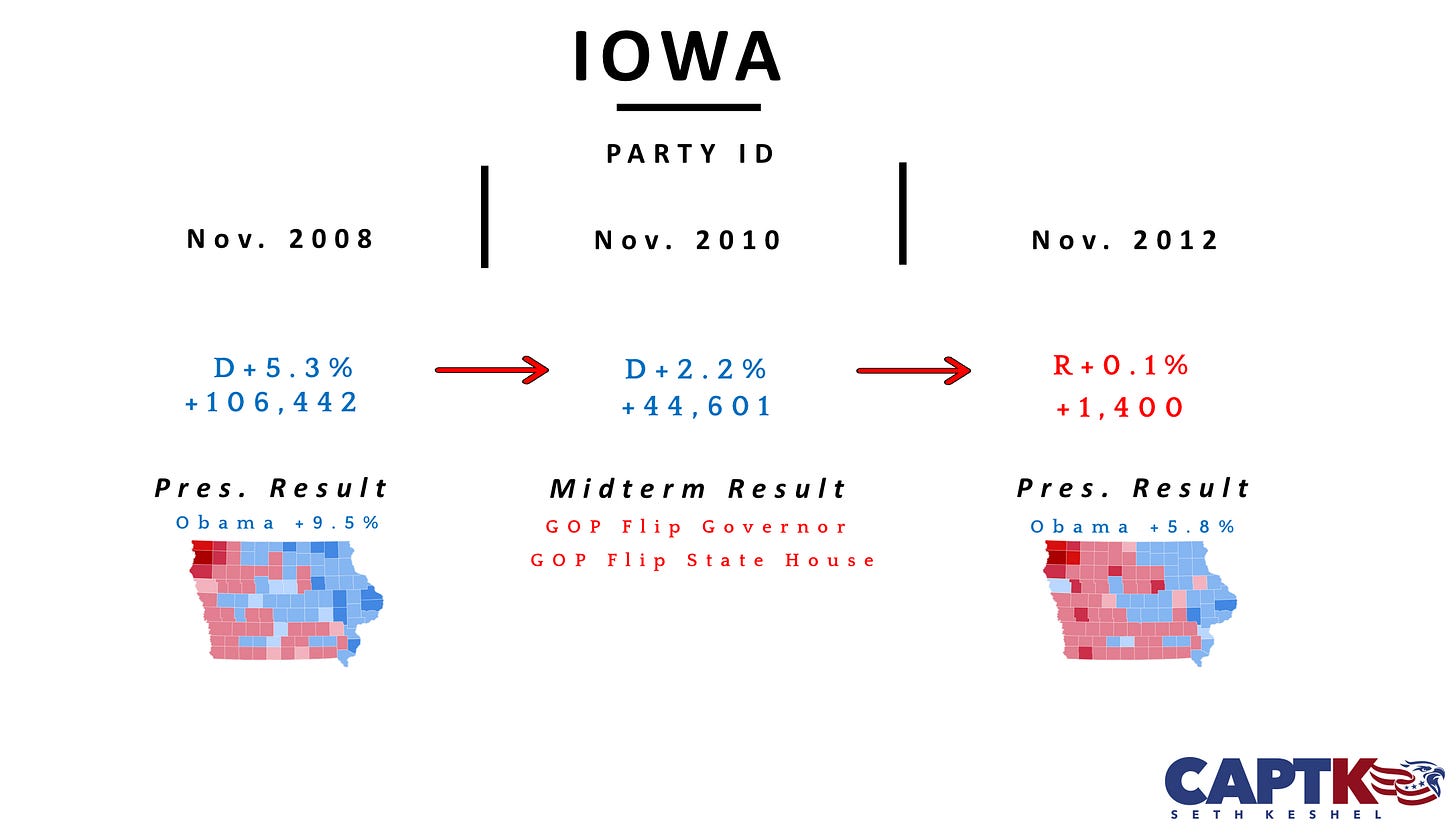 Moderate Iowa started sprinting rightward during Obama’s first term, with enough change (+61,841) present by 2010 midterms to flip the Governor’s Mansion and the State House. The Iowa legislature would prove crucial in the 2010s in passing strong election laws and turning the state into the red state it is today.