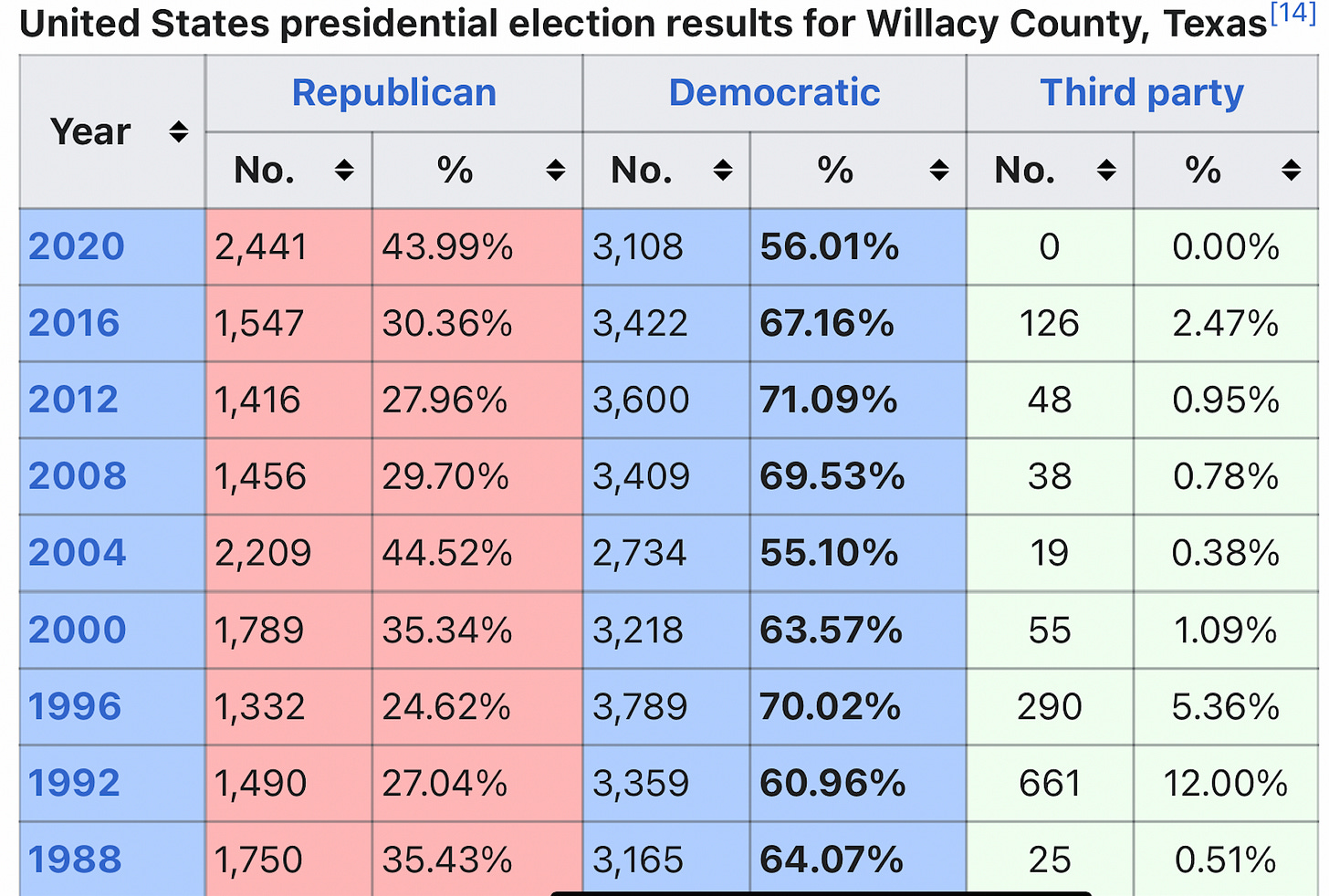 In assessing a long stretch of counties that show a “clean trend” in the 2020 election, I made my way into the Rio Grande Valley and was surprised by what I found in tiny Willacy County, population 20,164. President Trump lost the county, not won by a Republican since Nixon did the trick in 1972, by 36.8% in 2016, but limited Biden to a margin of victory of only 12.0% in 2020. Trump surged so heavily with the Latino working class that he won the Election Day vote and caused the Democrats to drop nearly 10% of Hillary Clinton’s votes from four years prior. These factors caused me to identify Willacy as a “clean” county for 2020, but what follows will justify why very few trust elections in Texas and beyond.