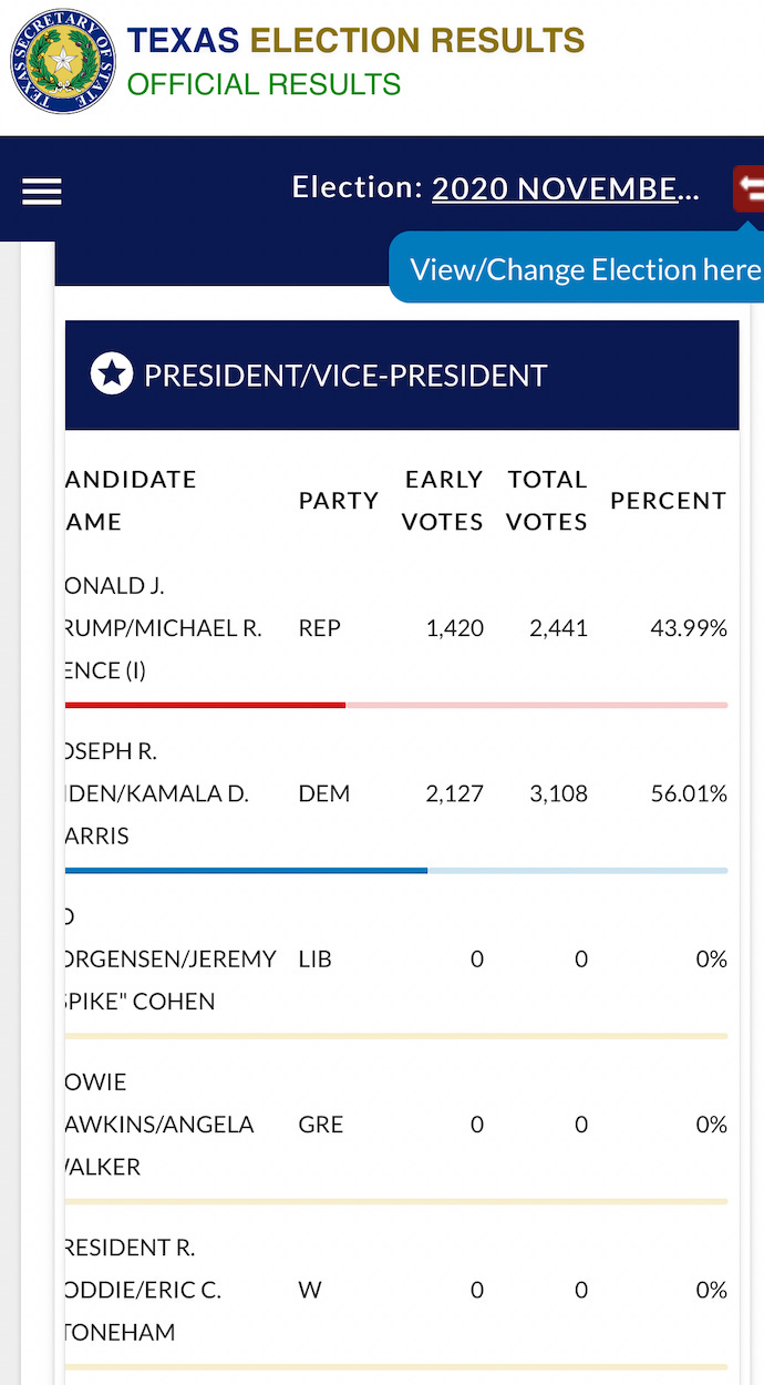 Strangely, the certified vote totals include zero votes for candidates not named Trump or Biden. That makes Willacy County the only county in Texas except for King County (total of 159 votes, 96% in favor of Trump) to not record a single “other party” vote. Even Loving County, with its 66 votes, recorded two in support of other candidates.