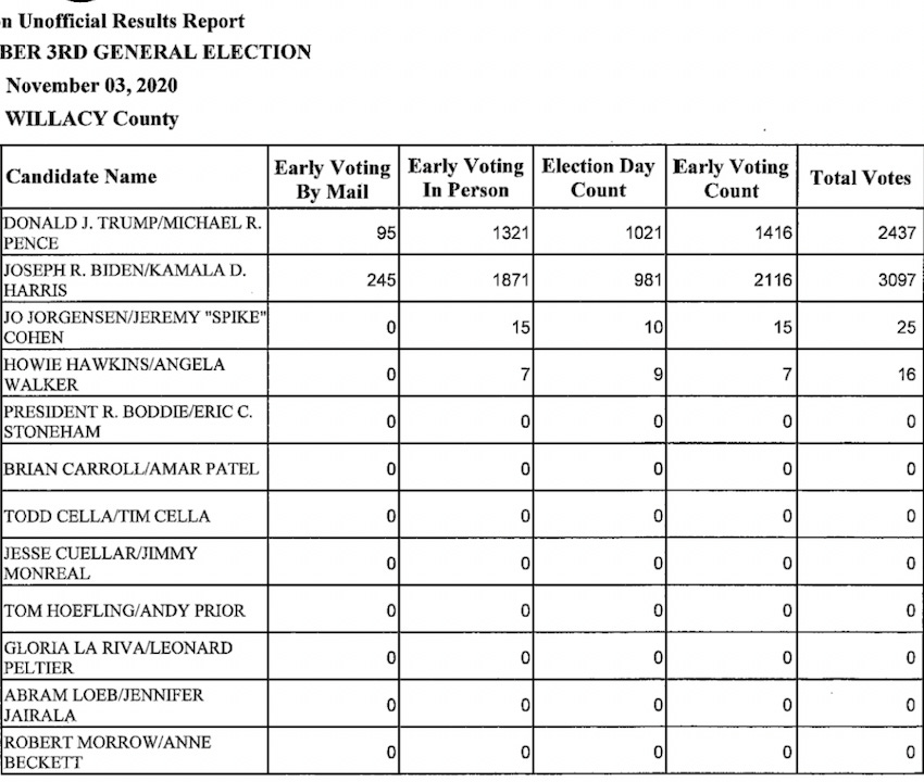 Then why does the unofficial results report from November 3, 2020, show 41 other party votes, with 25 for Jorgensen and 16 for Hawkins? From the Willacy County website: