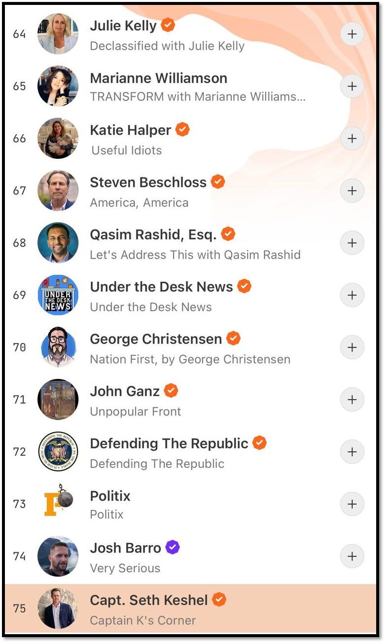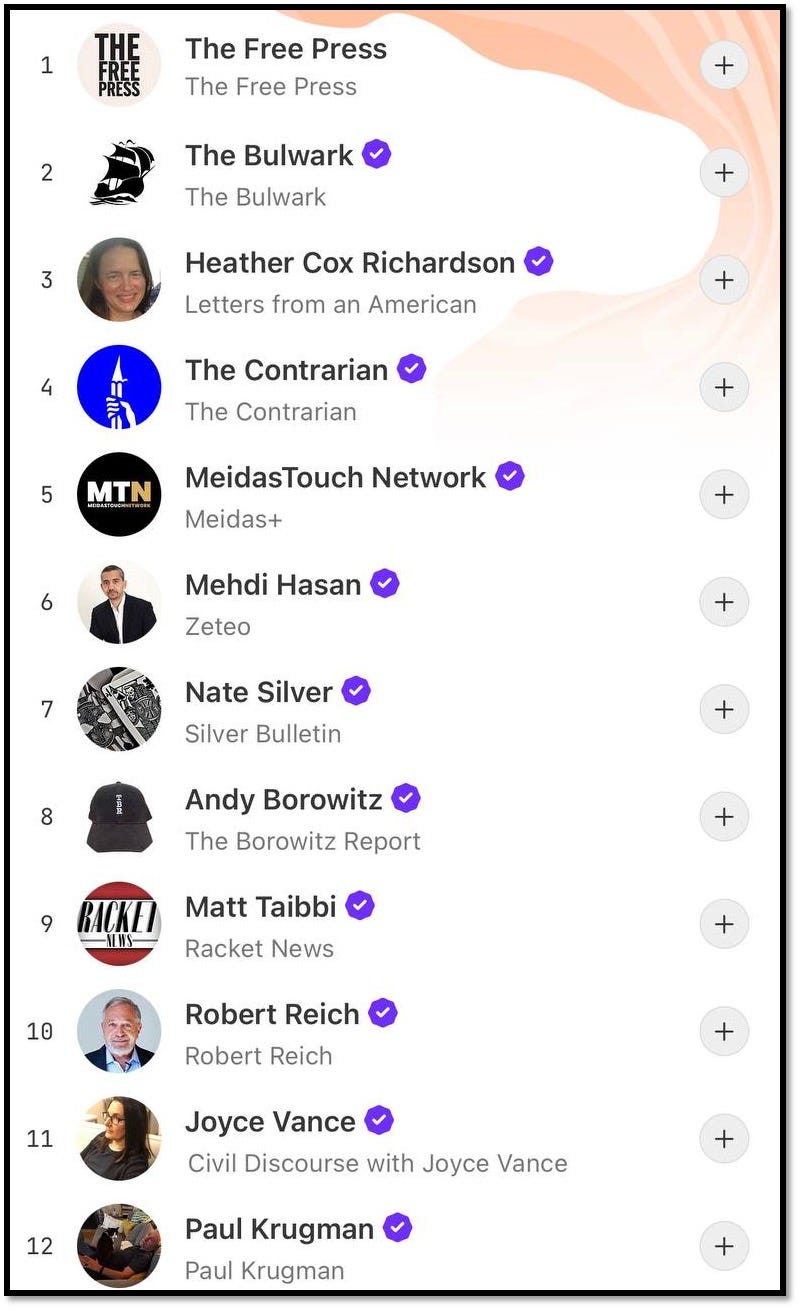 Kinzinger is 22nd this morning, but as you may discern, the top of the Substack pile is TDS-ridden and full of legacy media purple checks (over 10,000 paying subscribers) who regurgitate basic headlines, often through AI/A.I. (it’s obvious, go read some of their stuff). It goes something like this: