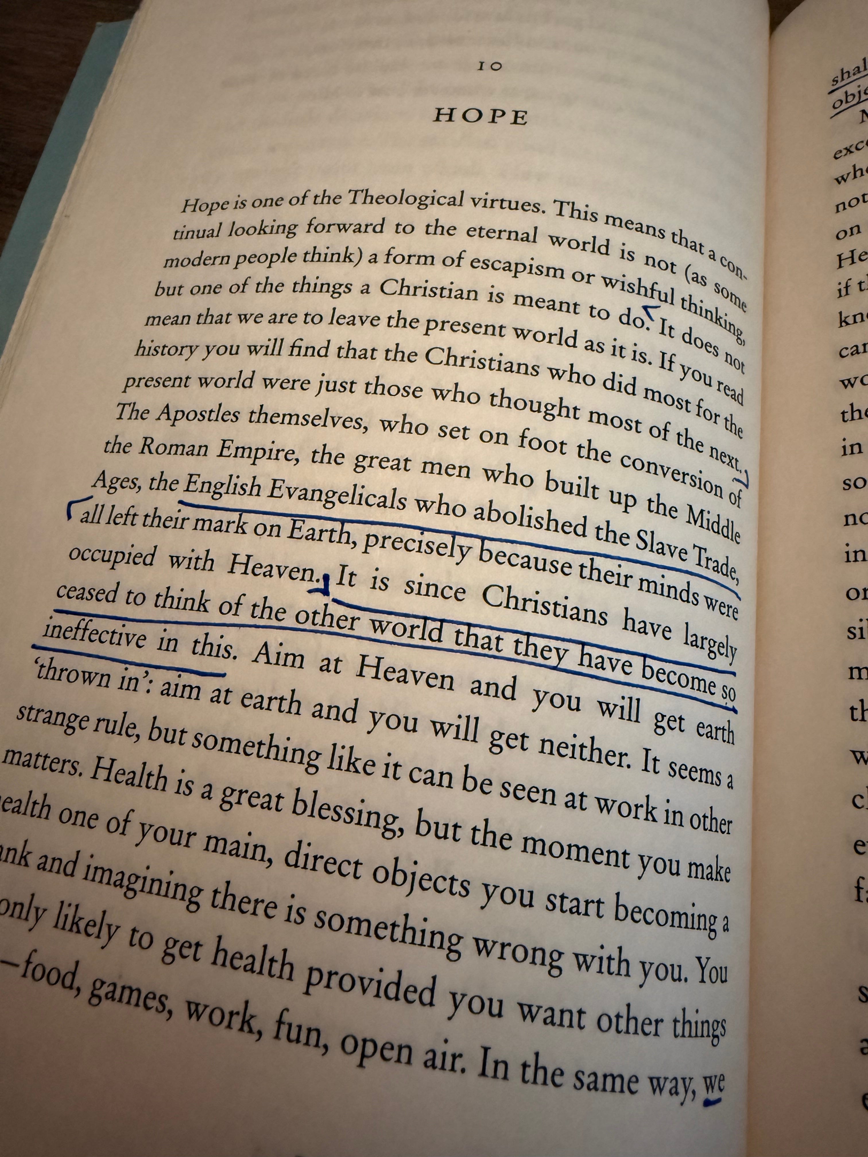 Hope is one of the Theological virtues. This means that a continual looking forward to the eternal world is not (as some modern people think) a form of escapism or wishful thinking, but one of the things a Christian is meant to do. It does not mean that we are to leave the present world as it is. If you read history you will find that the Christians who did the most for the present world were just those who thought most of the next. The Apostles themselves, who set on foot the conversion of the Roman Empire, the great men who built up the Middle Ages, the English Evangelicals who abolished the Slave Trade, all left their mark on Earth, precisely because their minds were occupied with Heaven. It is since Christians have largely ceased to think of the other world that they have become so ineffective in this. Aim at Heaven and you will get earth ‘thrown in’: aim at earth and you will get neither.