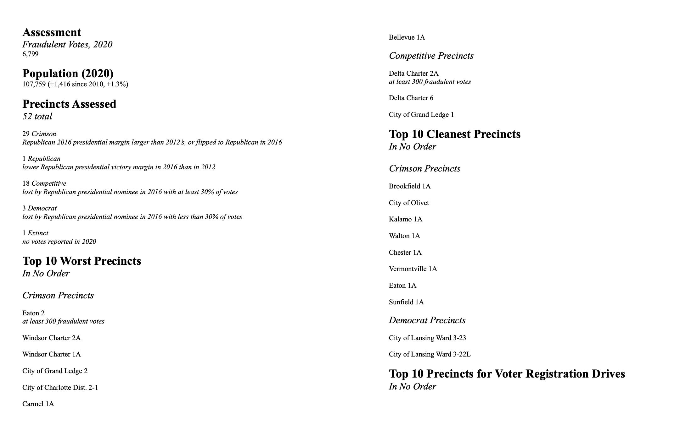 Finally, I include the best precincts for voter registration. These are the ones that had the highest gross increase in Trump votes in 2020, and as such, are likely to be the most fertile fields for amping up vote totals in 2024.
