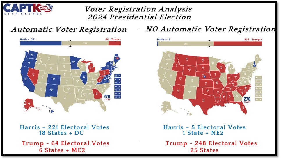 Just like slamming down Whoppers every day for 40 years suggests the likelihood of clogged arteries, adopting or implementing Automatic Voter Registration in a state suggests it will vote for Democrat presidential nominees and favor that party’s candidates in other races.
