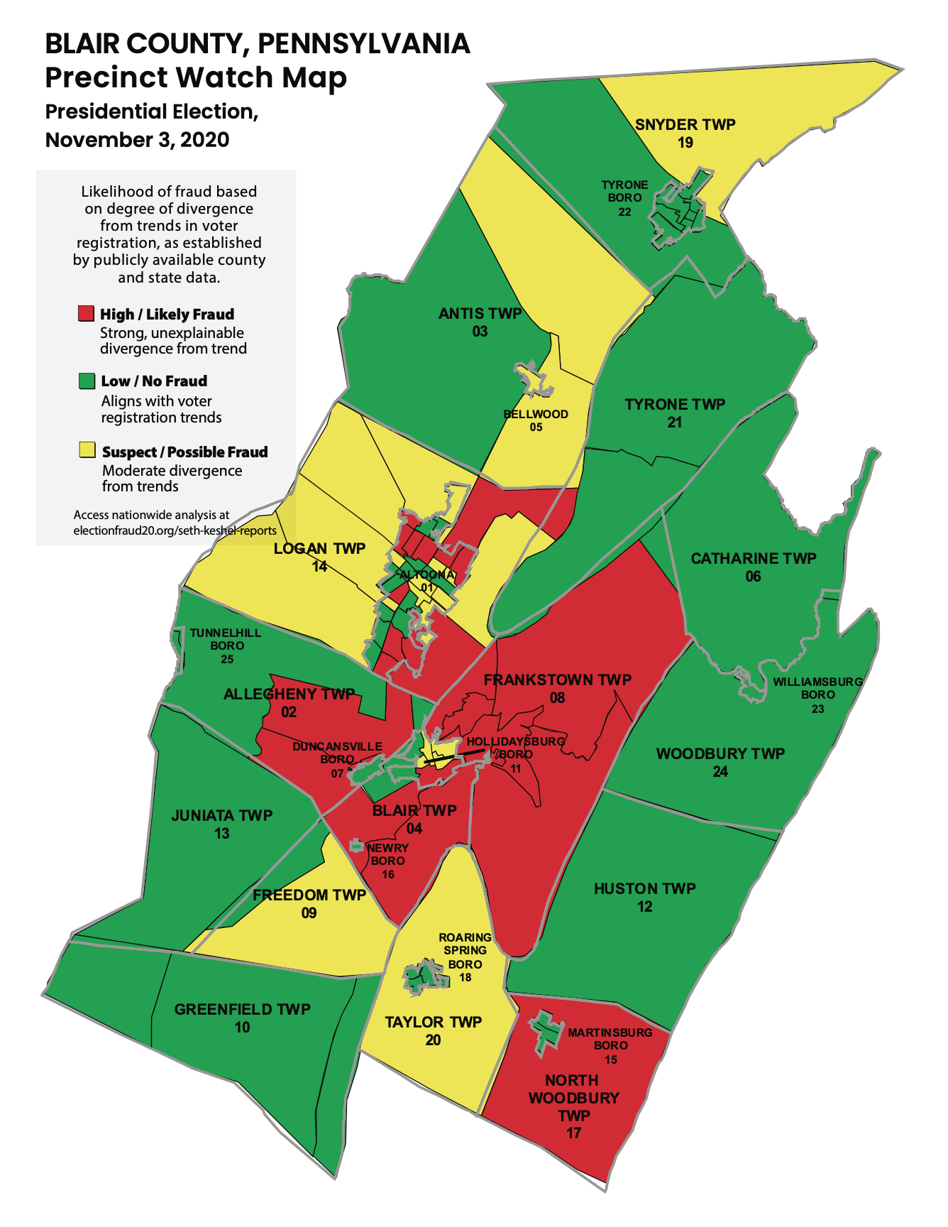 Why is the important, you may ask? Because I can dig to the lowest level in the smallest counties and find major divergence of statistical trends that point to the areas most likely leveraged for mail-in and ballot harvesting fraud in the 2020 election, like in Blair County, Pennsylvania, which I estimated at 4,136 votes too high for Biden based on party registration trend, incumbent vote gain, population data, and the trend of the four preceding elections: