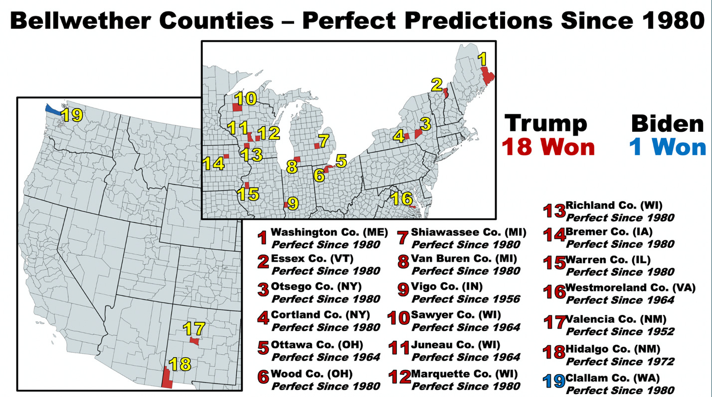 Fortunately, 10 Irrefutable Points of the 2020 Election, all of which demand investigation, were presented by yours truly at the Sioux Falls Cyber Symposium last August. The very first point tells the curious tale of how the incumbent President carried the national bellwether counties that had been perfect for four decades, but somehow managed to lose reelection.