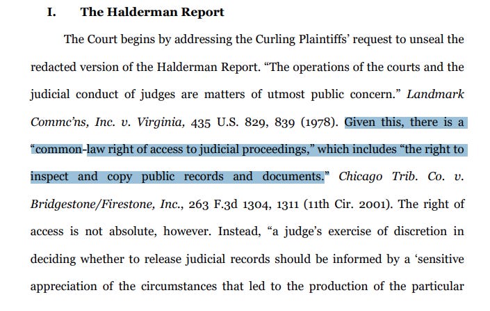 In the capture above, from Judge Totenberg’s order, Chicago Trib. Co. v. Bridgestone/Firestone, Inc., 2001, is cited, and refers to common-law right of access, clearly referring to trade secrets and confidential documents as it applied to the tire company two decades ago and their product’s involvement in a wrongful death. This raises the question of whether reports and expert witness highlighting system vulnerabilities now require, under common law, for election systems vendors to cough up trade secrets, source code, and other proprietary information in the interest of resolving the crisis of lost public trust in elections. Does Judge Totenberg’s order now give the green light for citizens to make common law cases in the interest of election security?