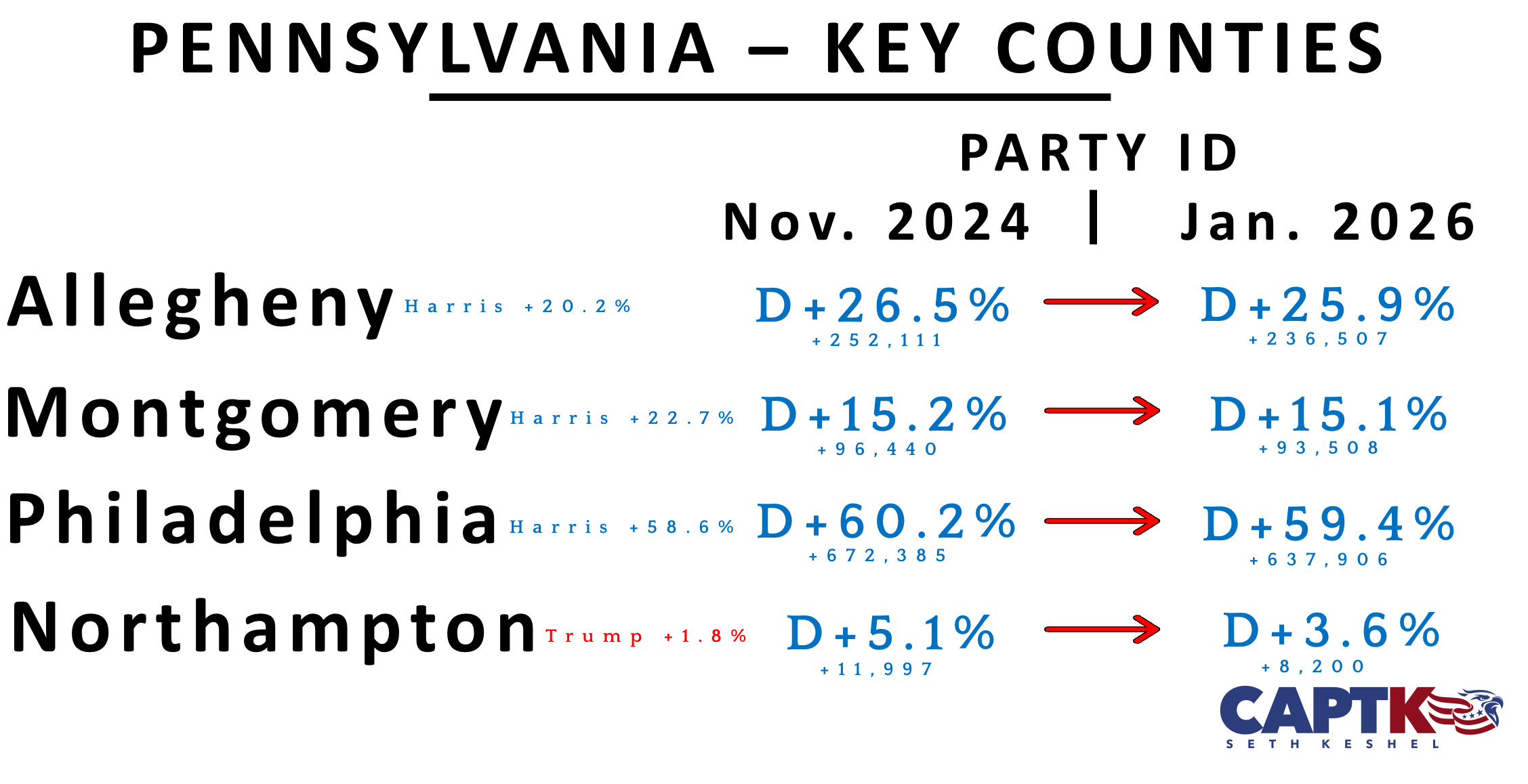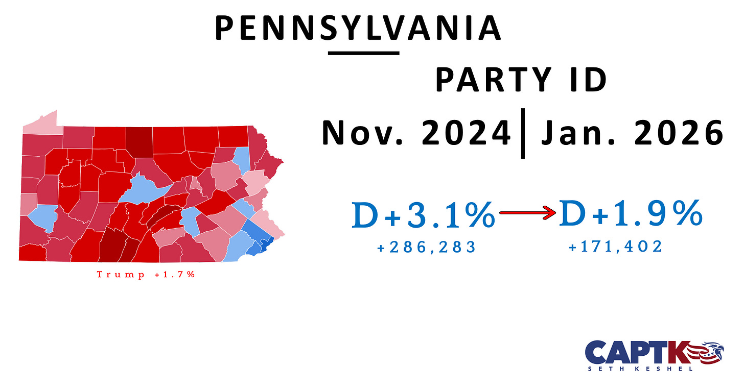 Democrats have lost roughly 40% of the registration advantage they held in November 2024, when Trump won the state comfortably. There is no sign the white working class of Pennsylvania will revert to Democrat roots present in the data.