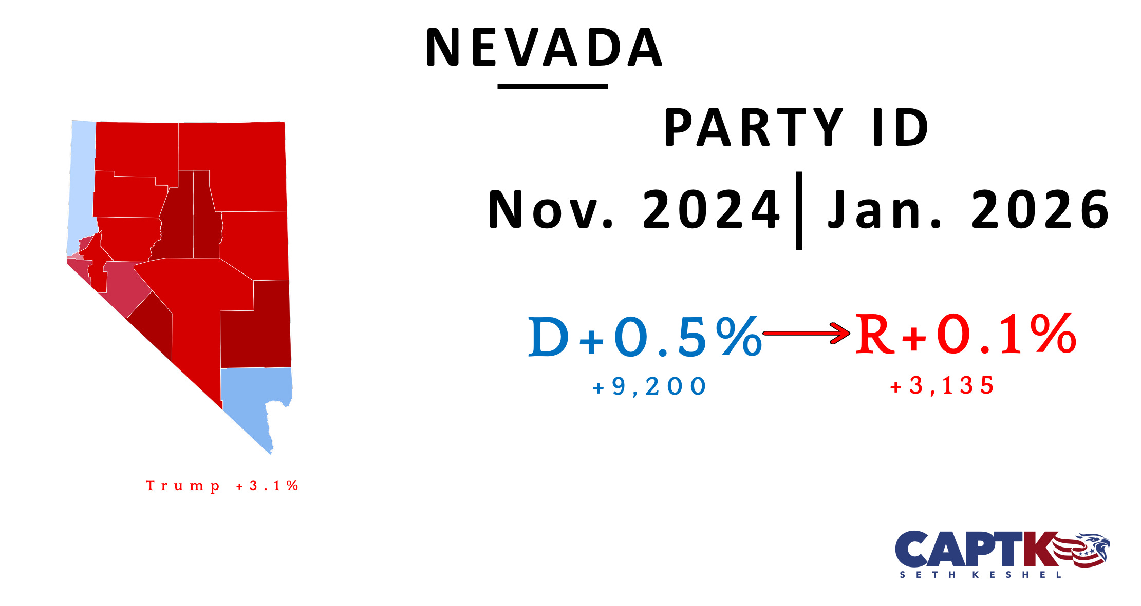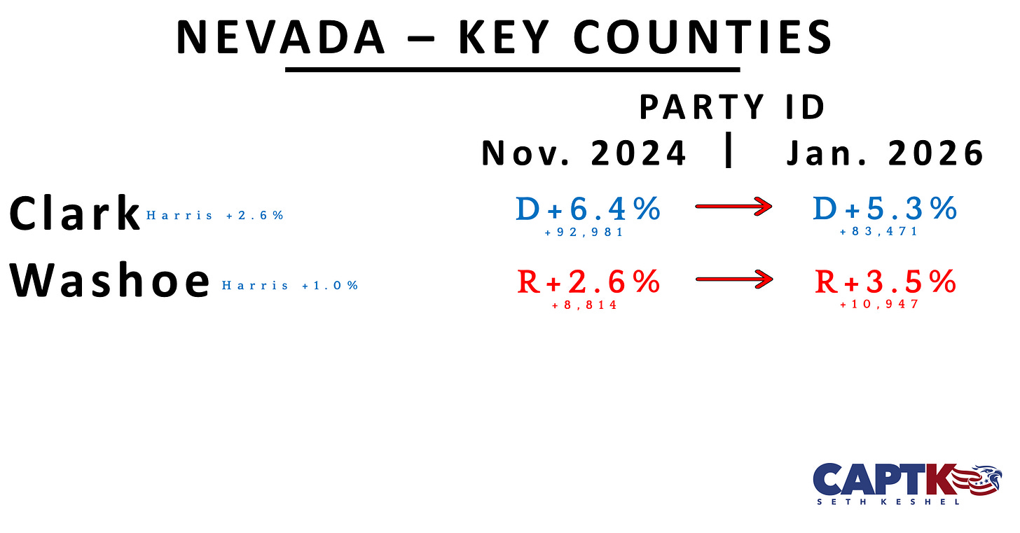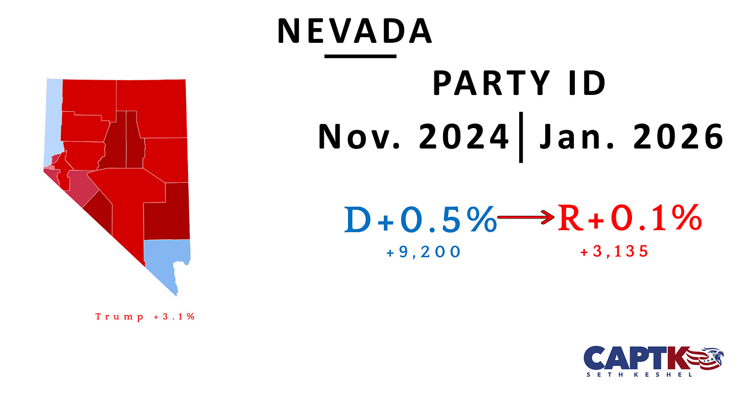 The month represents a strong net pickup for Democrats, who have lost the overall lead in voter registration they held for nearly two decades since the 2024 election; however, there is no net change in Washoe County for the month (to the exact number), so the +288 Democrat pickup in Clark County overall is likely statistical noise, especially since their advantage expressed as a percentage dropped by a tenth of a point with changes to the overall roll (increase in independent voters).