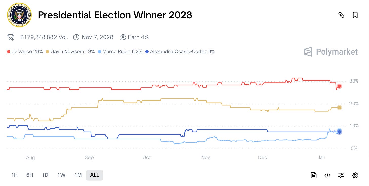 We will see registration data pick up ahead of primaries and have a better idea how the future is shaping up. Bettors on Polymarket seem to understand the value of voter registration by party in the long run, as shown by the likely GOP nominee being the favorite to win in 2028: