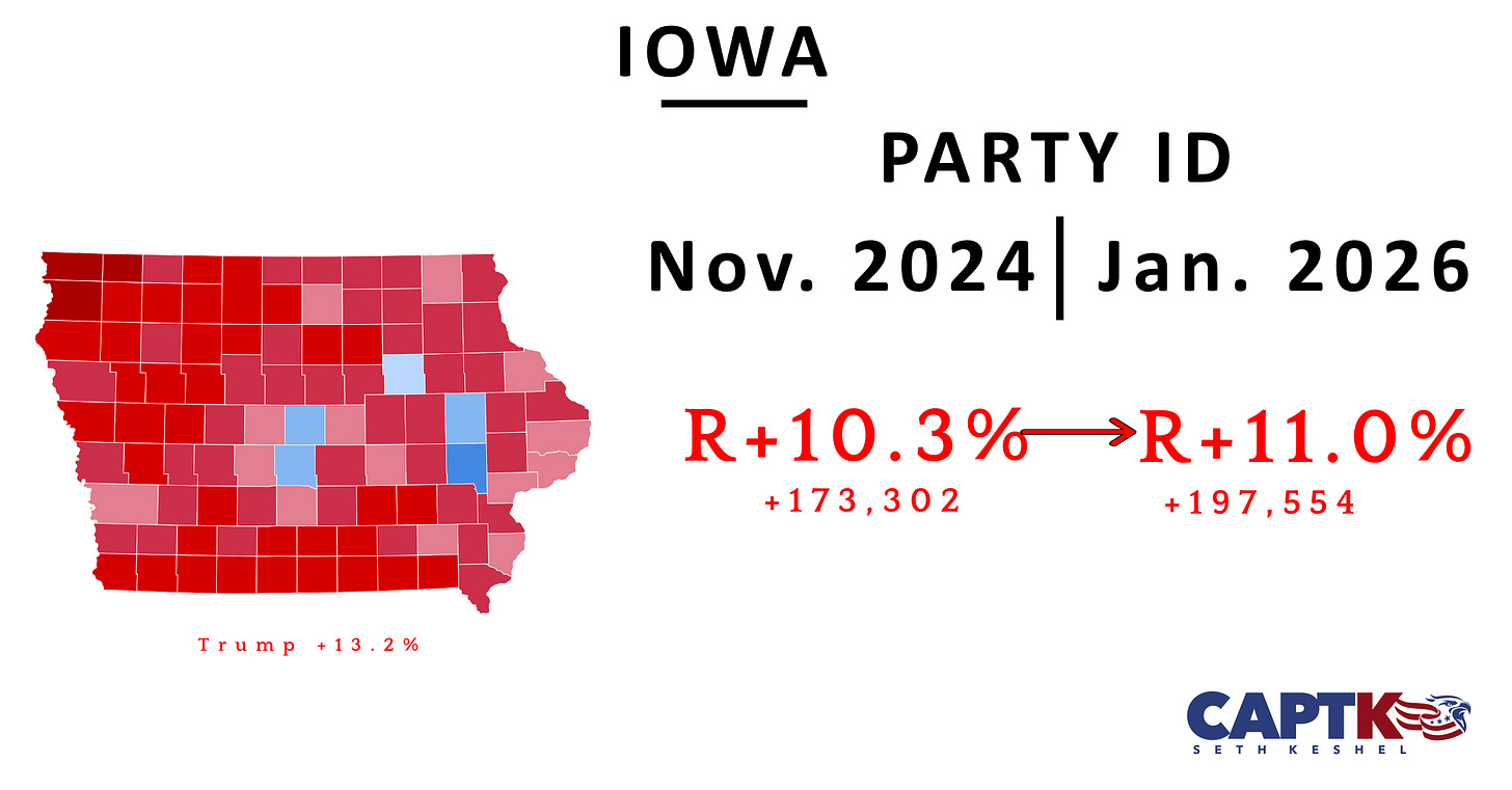 Another consistent monthly gain for Republicans in a two-time Obama state. Iowa is no longer playable for Democrats at the state level, but will have two competitive U.S. House races this year; most importantly, the state tracks with Wisconsin and Minnesota as a proxy, given that those two states don’t register voters by party.