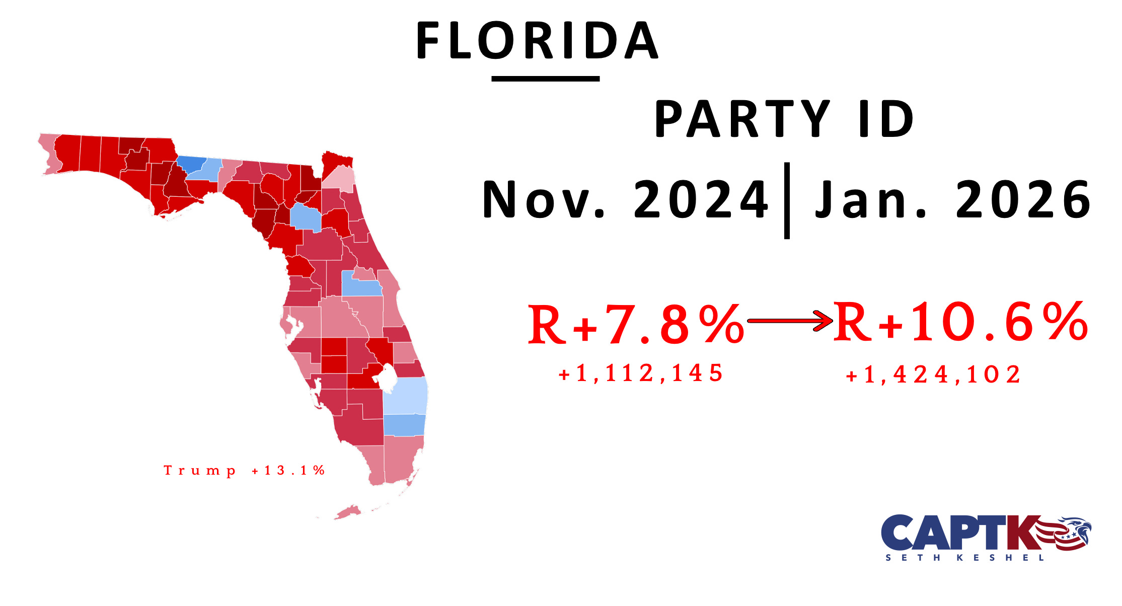Florida appears to be turning the corner on being consistently redder than Texas, and continues to highlight the dramatic party registration advantage favoring Republican voters among transplants from other states.