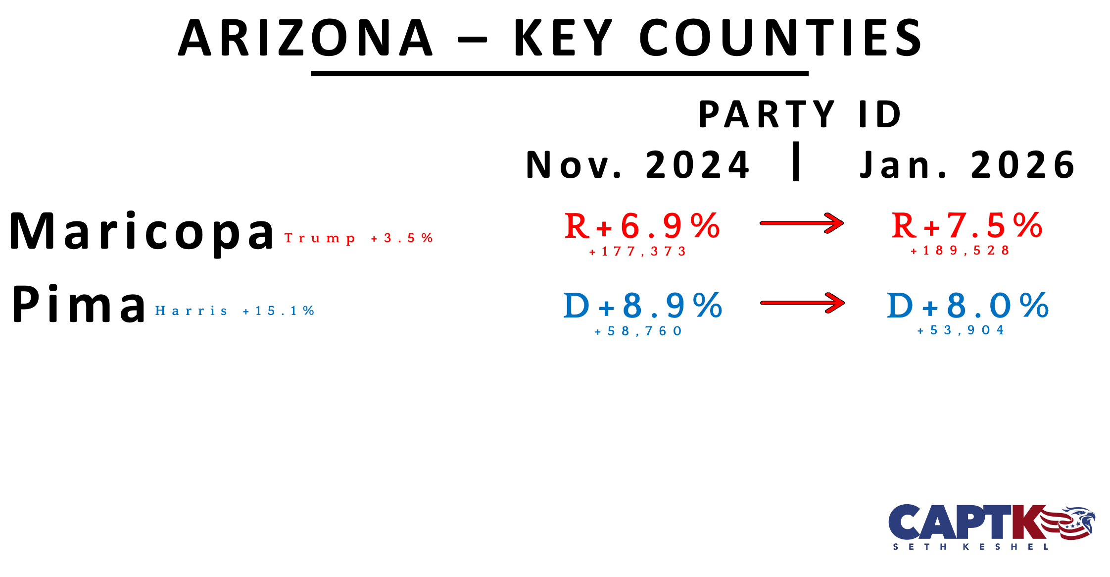 December was a sleepy month; Democrats picked up 314 net, driven primarily by a net pickup of 341 in Maricopa County; however, Pima County drifted slightly rightward. Statistical noise any way you slice it, but there is no blue undercurrent in this state if you don’t see it manifest in Pima.