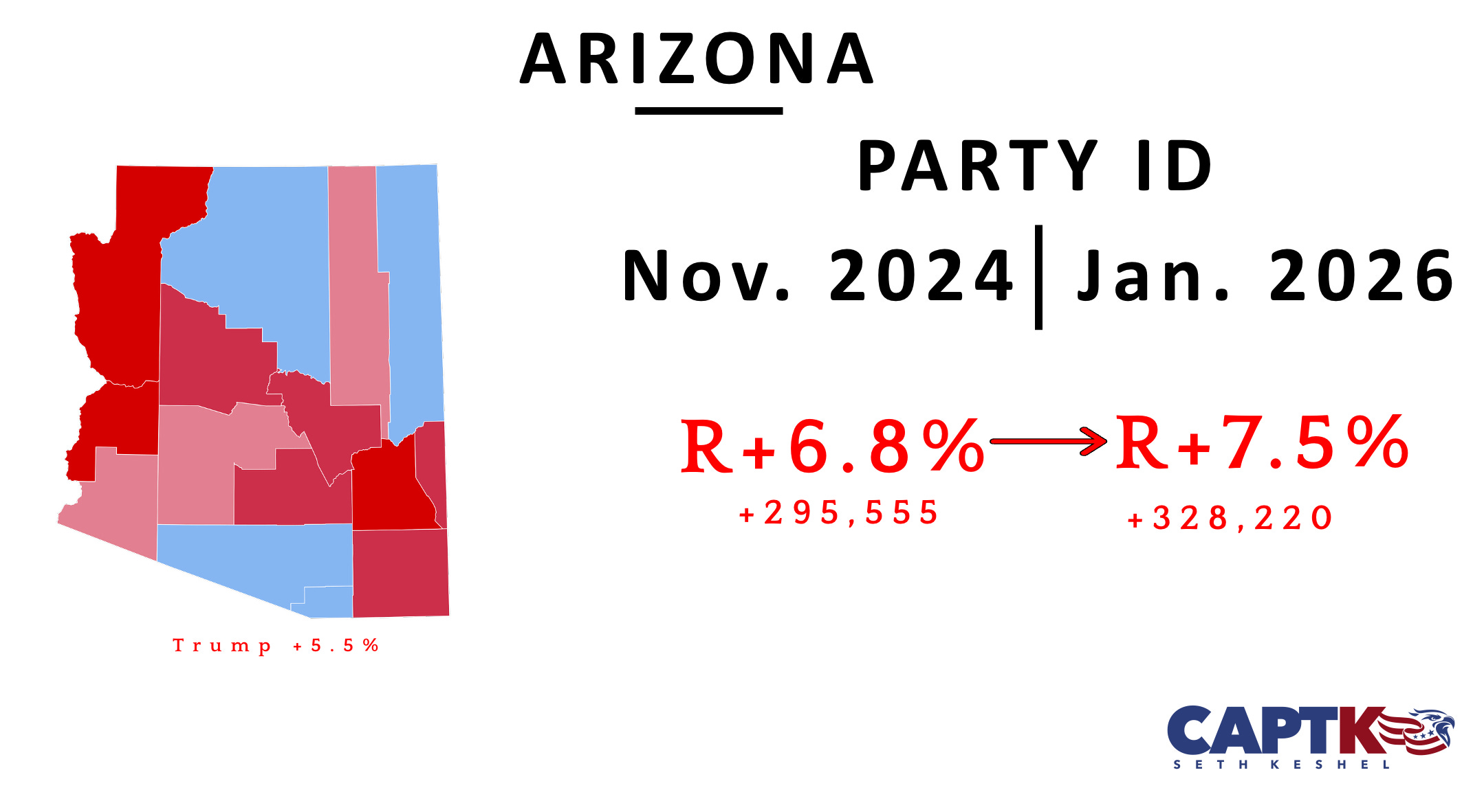 My unofficial numbers for Arizona registrations include constant updates for Maricopa and Pima Counties, which I have access to. There is sometimes a wide variance between my figures and the numbers periodically reported by the Secretary of State. Recent election cycles include a January statewide update, so I suspect all 15 counties will be reported shortly and reflect the continuous GOP registration gains for next month.