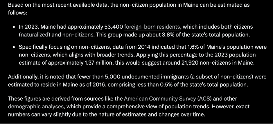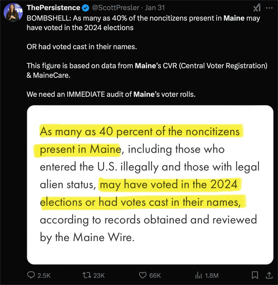 This article, which will be much shorter, falls under the category of I Told You So. I have been so engrossed in evaluating the 2024 election that I missed The Maine Wire’s New Year’s Eve research article (which can be read here) revealing that Maine’s own records show 40% of the state’s noncitizen population have a ballot on file for the 2024 election. I searched this piece out when I saw a recent post authored by Scott Presler decrying the findings: