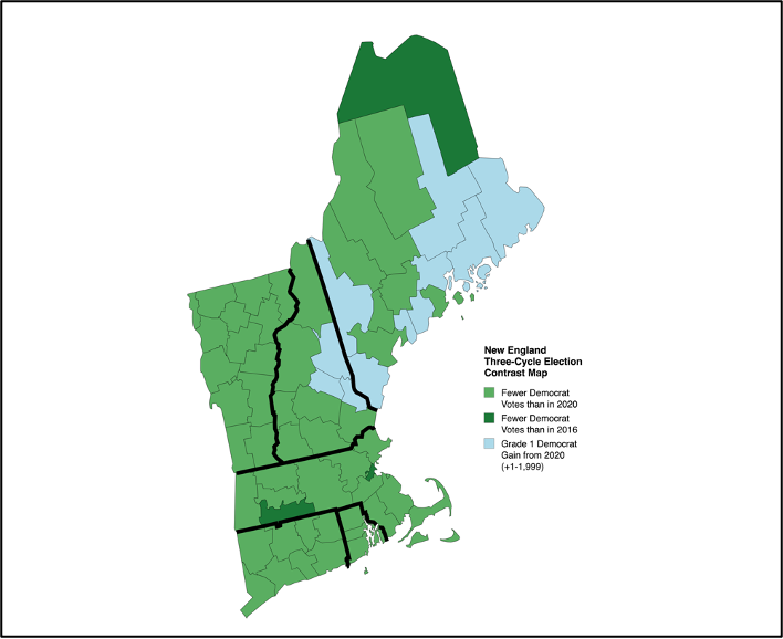 · Harris gained ballots over Biden’s total in 8 of 16 counties statewide (50%), but in only 2 of 51 (3.9%) counties in the rest of New England.