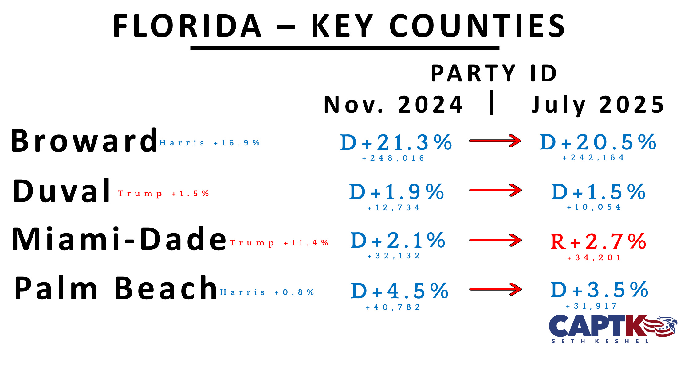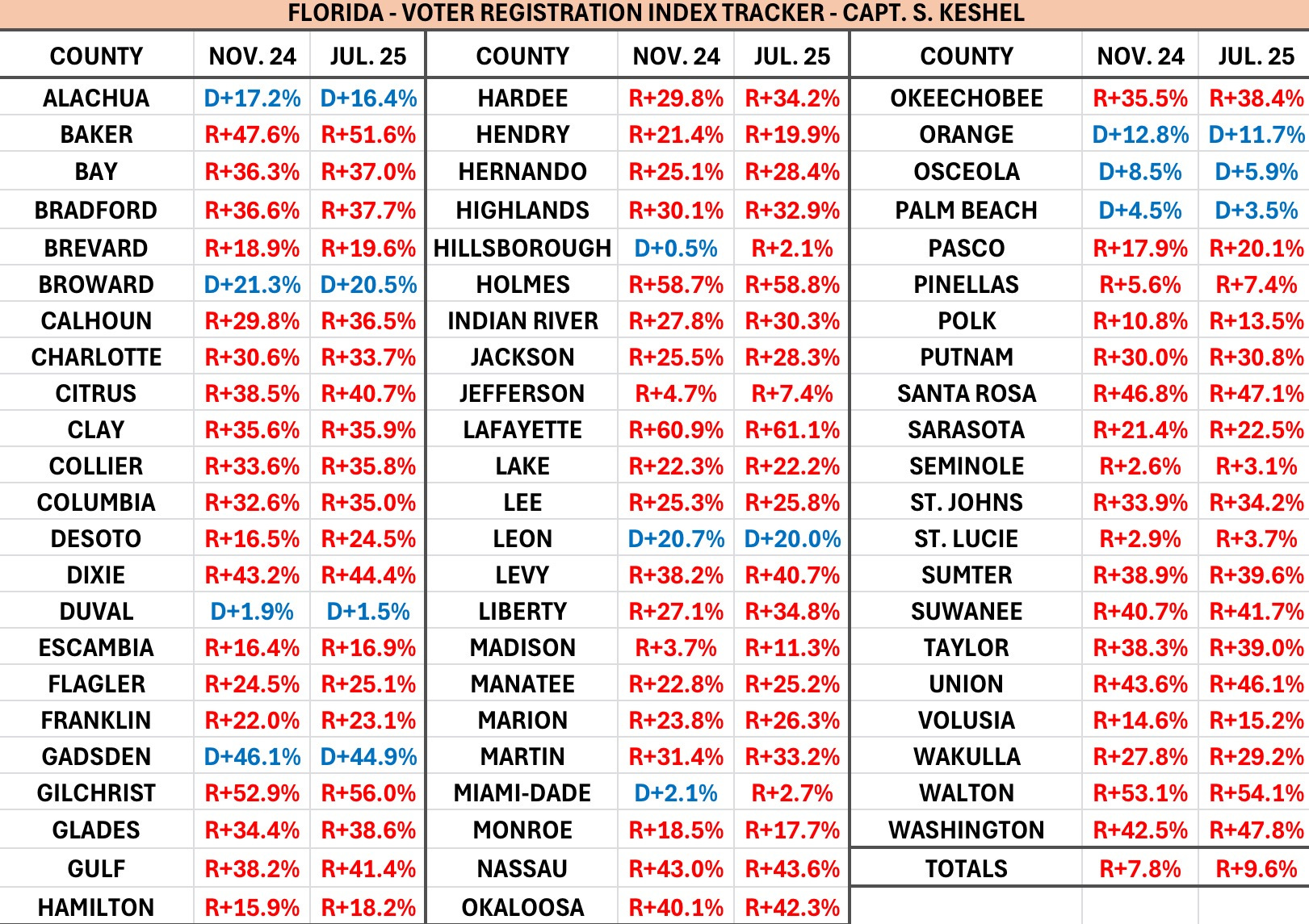 64 of 67 counties are more Republican or less Democrat than they were in November 2024 (Trump +13.1% win). Two counties, Hillsborough and Miami-Dade, have flipped to GOP registration advantage since then.