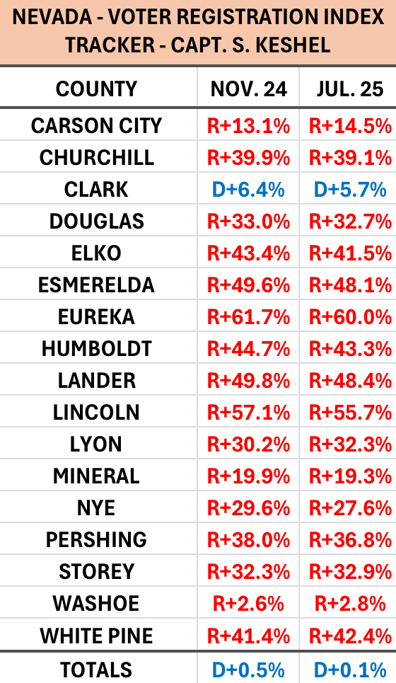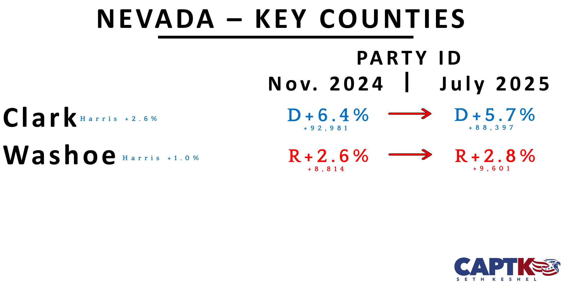 Clark remains the biggest show in town, and it is well to the right of where it was in November, when Trump won Nevada by 3.1%.