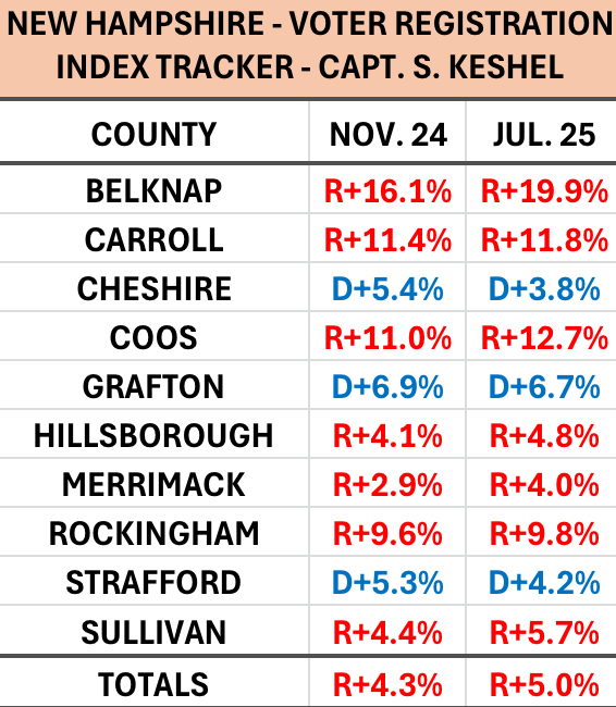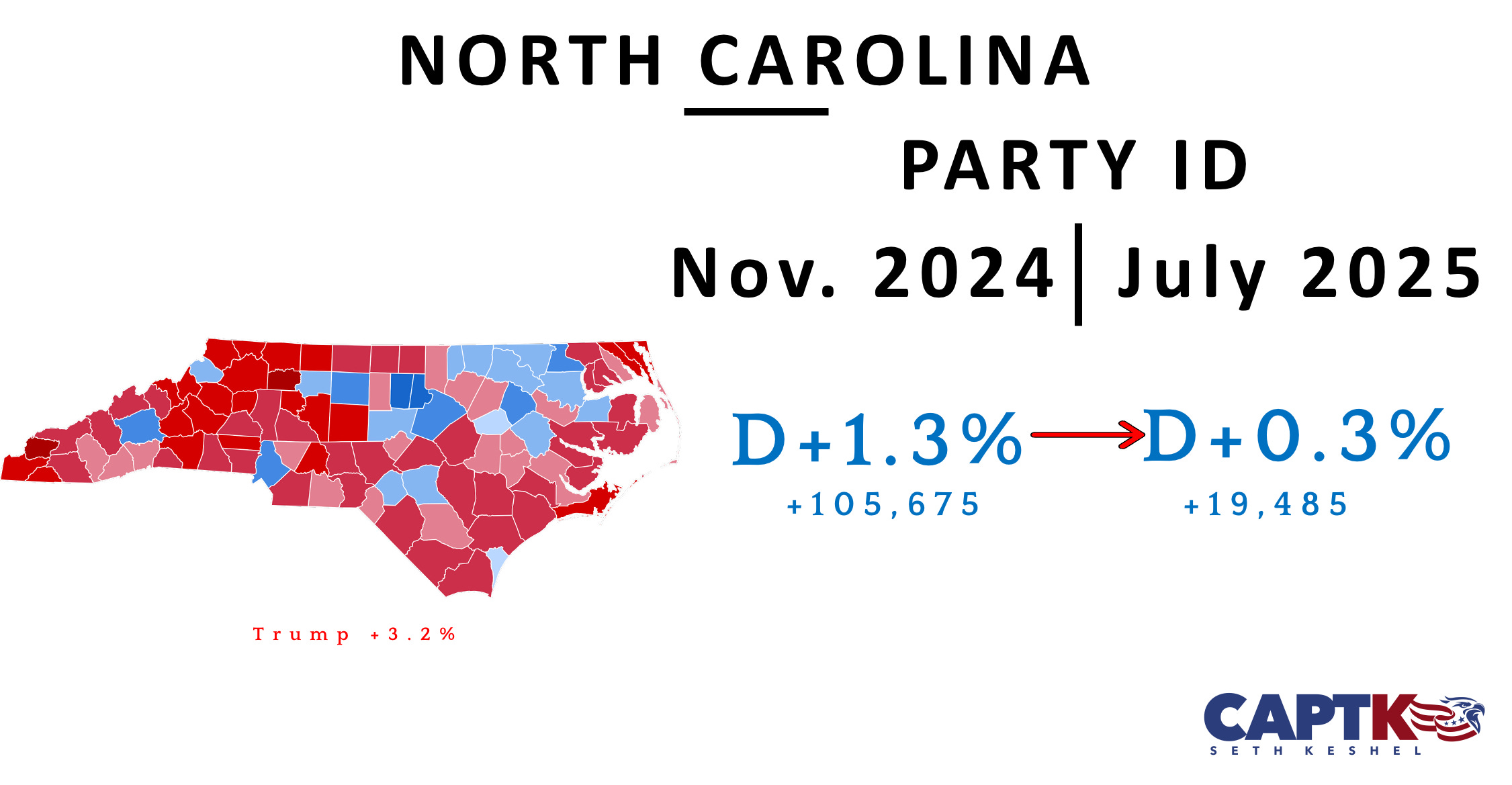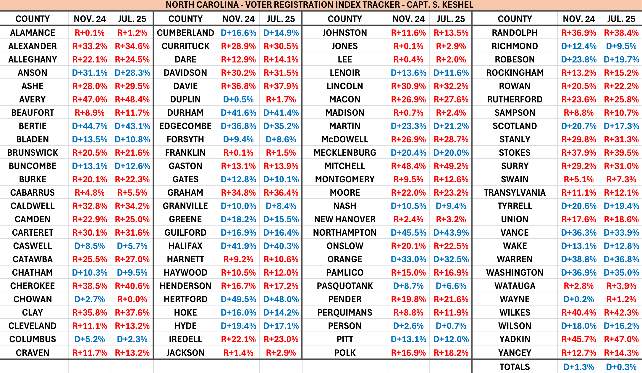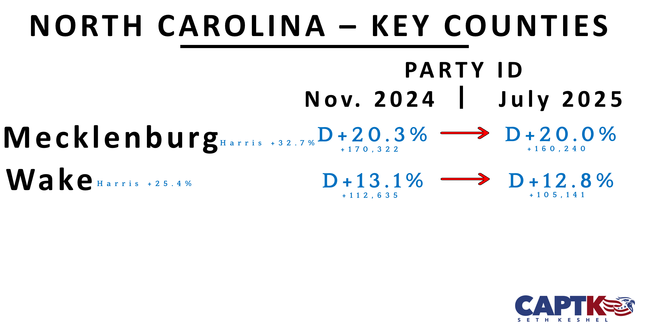 No mercy for Democrats in North Carolina, where 100 of 100 counties are shifted more Republican or less Democrat than they were in 2024. It is important for Wake and Mecklenburg GOP affiliates to erode the Democrat advantages as much as possible in those states given the Democrats’ inability to compete elsewhere.