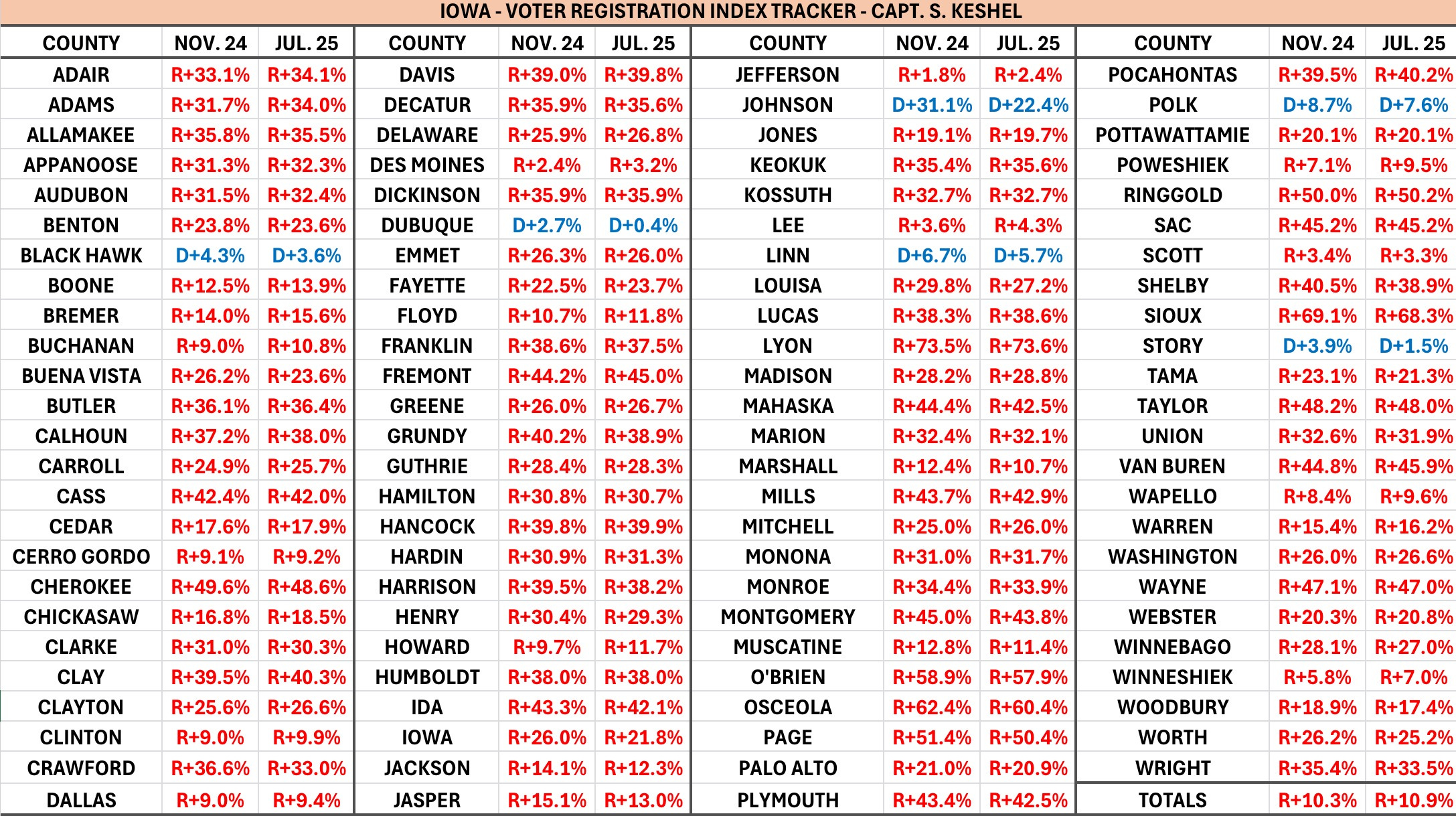 Iowa approaches R+11% in this month’s update, with all blue counties substantially diminished in Democrat advantage since November. This is important, because two of the most important House races next fall will come down to IA-1 and IA-3, both narrowly held by GOP members last fall.
