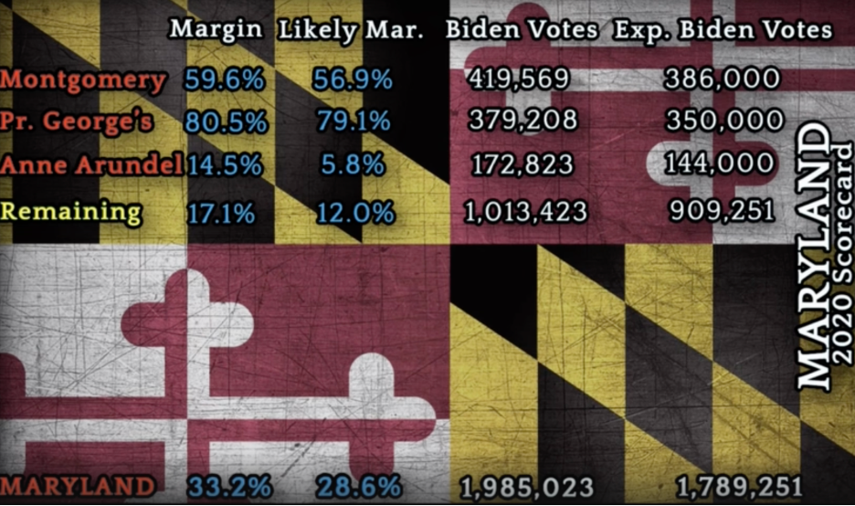 · Democrat margins in the state’s two largest counties, Montgomery and Prince George’s, are crushing, netting a margin for Biden in 2020 of 660,465 alone. The City of Baltimore and Baltimore County (separate from the city) provided another 294,093 together.