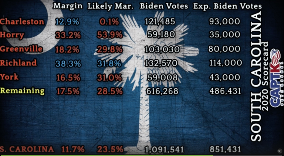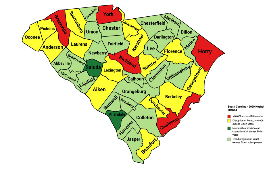 My analytical method spots at least 23,030 fraudulent votes in Greenville, Horry, and Charleston Counties, the latter of which I believe Trump narrowly carried.
