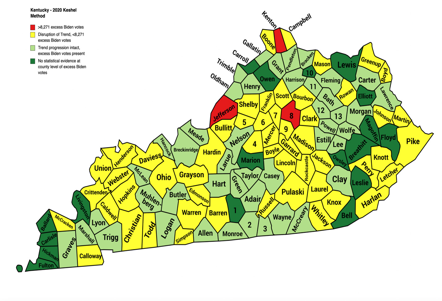 Trump’s 2020 win in Kentucky resembles his Ohio victory - significantly large, but to the left of his 2016 margin despite all indicators suggesting the region’s blue-collar states should have moved to the right, which would have solidified Pennsylvania and Michigan for Trump. My analytics suggest Jefferson, Fayette, and Kenton Counties were outfitted with the most fraudulent ballots, enough to push the state more than 8 points off its likely trajectory. Despite Kentucky moving eight points more Republican in registration from 2016, and Trump adding more net new votes than his first run there, and two consecutive cycles of Democrat vote loss, Joe Biden gained 143,620 net new votes over Clinton’s 2016 total, while Trump only added 123,675.