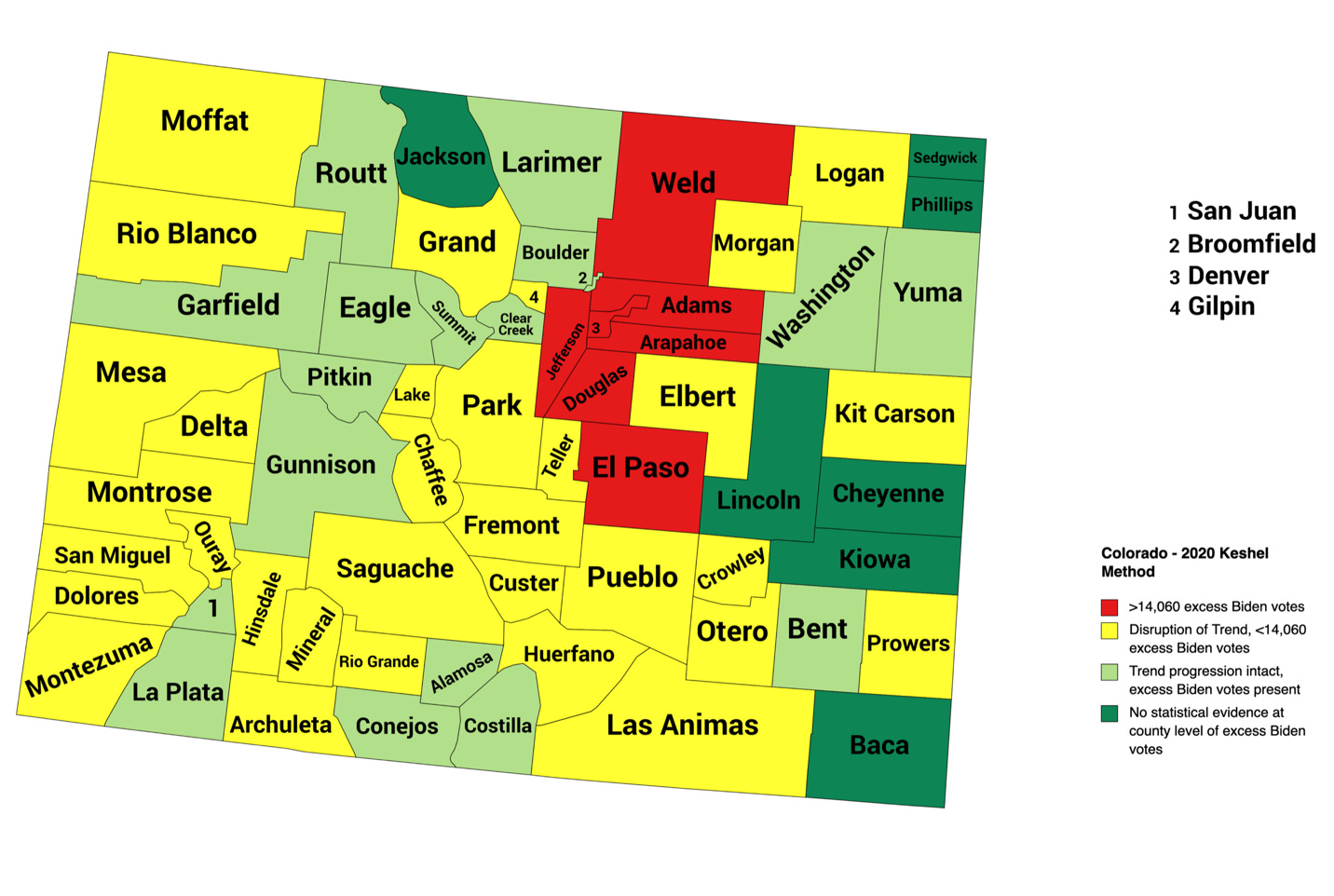 Trump continued to expand his reach in southern Colorado and with Hispanic voters after having won two counties (Las Animas and Pueblo) in 2016 that had not backed a Republican presidential nominee since Richard Nixon in 1972, but had his winning margins (especially in Douglas, El Paso, and Weld Counties) severely trimmed by massive cheating and was swamped by metro Denver and Secretary of State Jena Griswold’s “fortified” election system, which was also enough to flush Republican Cory Gardner out of the U.S. Senate on the same evening. Denver County’s Biden margin (61.4%, 241,675, zero Trump-won precincts) was 59,814 larger than Clinton’s in 2016, and alone was larger than the margins of all Trump-won counties combined. Colorado’s reliance on universal mail-in voting, which is always accompanied by ballot harvesting and resupplied by a fresh cache of new registrations supplied by Automatic Voter Registration, made the 2020 race here one of the most corrupt in the country. The state would have likely settled just inside 6 points, marking only a slight leftward bump from 2016, which had a large third-party vote share. This election was so clean, as insisted on by Griswold, that the order was given that 2020 election audits were strictly forbidden in the state. On a side note, exposure of election manipulation in Republican stronghold Mesa County has given election integrity activists a boatload of information about the electronic elections infrastructure, and has come at great personal cost to those involved.