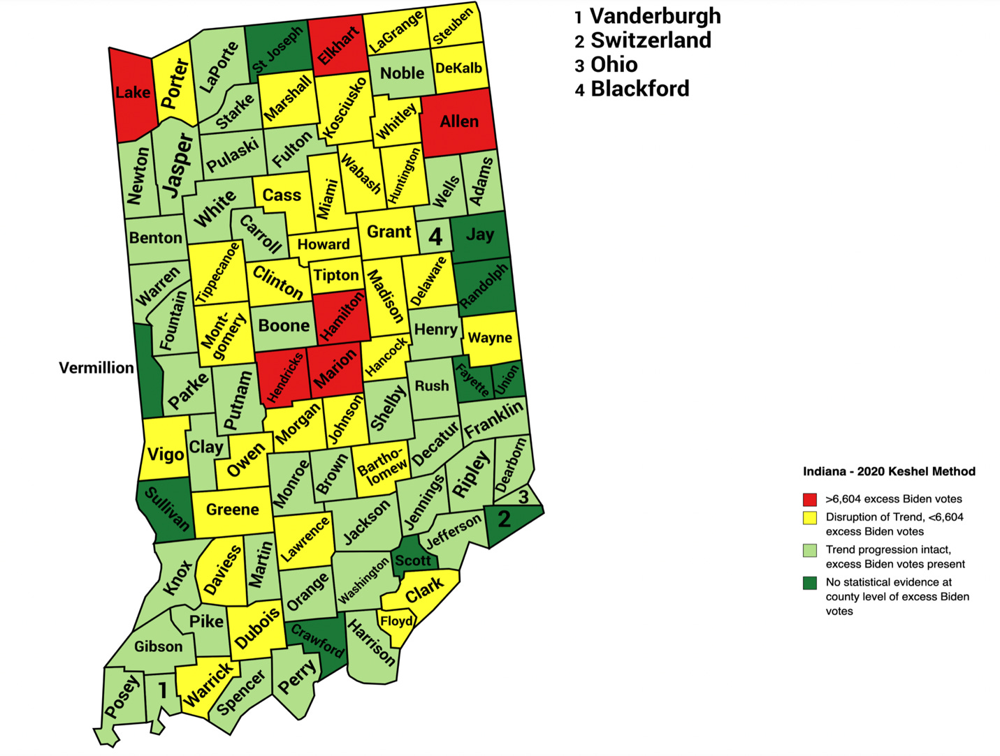 Trump’s 2020 win in Indiana resembles his victories in surrounding states Kentucky and Ohio - significantly large, but to the left of his 2016 margin despite all indicators, including incumbent vote gain, suggesting the region’s blue-collar states should have become more Republican as a percentage of margin, which would have solidified Pennsylvania and Michigan for Trump. Biden won just four counties in the certified results, including Lake, home to run-down and dilapidated Gary, and Marion, which houses most of metro Indianapolis. Those two counties, along with Trump-won Hamilton and Allen Counties, are the four worst in the state for 2020 manipulation, with Marion leading the way by sheer size alone. Hamilton, which has backed every GOP nominee since 1916, was shaved down to just 6.8% in favor of Trump despite a modest gain from 2016, when he won the county with ease. Perhaps most shocking, despite Trump’s gain in net new votes being the largest since 2004 (+172,230), Biden gained 209,290 votes over Hillary Clinton’s total against the political grain of the state.