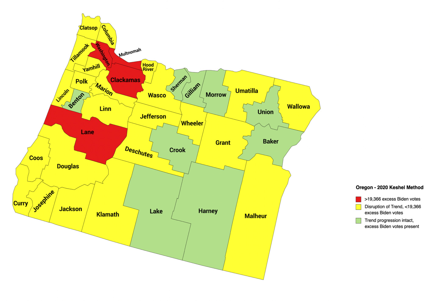 · Oregon’s urban dominance, much like Washington’s Seattle-based Democrat dominance, swamps the rest of the state, despite Trump having carried 26 of 36 counties in certified results. The state’s maladministration of its own election cost Trump long-time GOP strongholds Marion and Deschutes Counties, which he won in 2016.