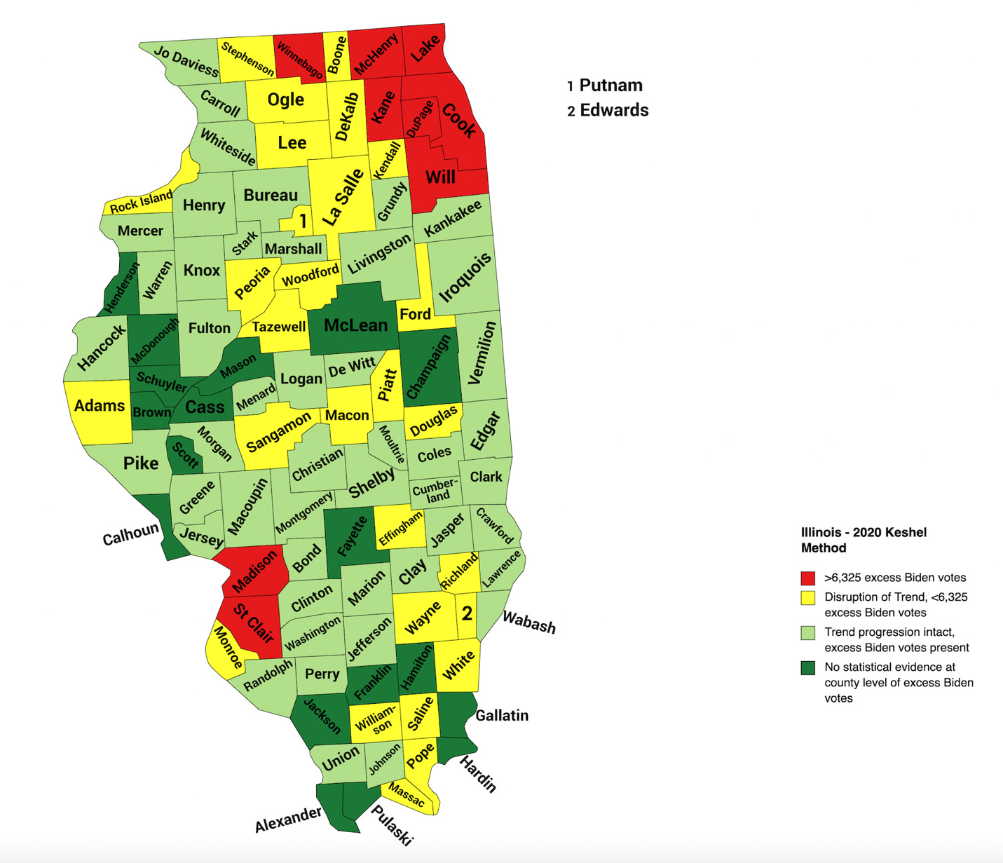 Outside of the area across from St. Louis (Madison and St. Clair Counties), central and southern Illinois fared far better than comparable areas in Wisconsin or Minnesota did in terms of election quality. Northeastern Illinois, especially the six counties outlined earlier in this report, is eaten up with election manipulation and Chicago cartel corruption. My estimate for Cook, Lake, Will, Kane, McHenry, and DuPage Counties together comes out to 227,950 likely fraudulent ballots, and that estimate is lenient on Cook and comes with the generous and certainly naïve assessment that all previous election totals can be relied upon for legitimate analysis (Bob Dole’s farewell letter runs counter to this notion). Trump gained over 300,000 net new votes statewide from 2016, and should have closed the margin substantially, down to at least 12.4% rather than the certified 17.0%. Illinois’ artificially large margin gives cover for election results in southern Wisconsin.