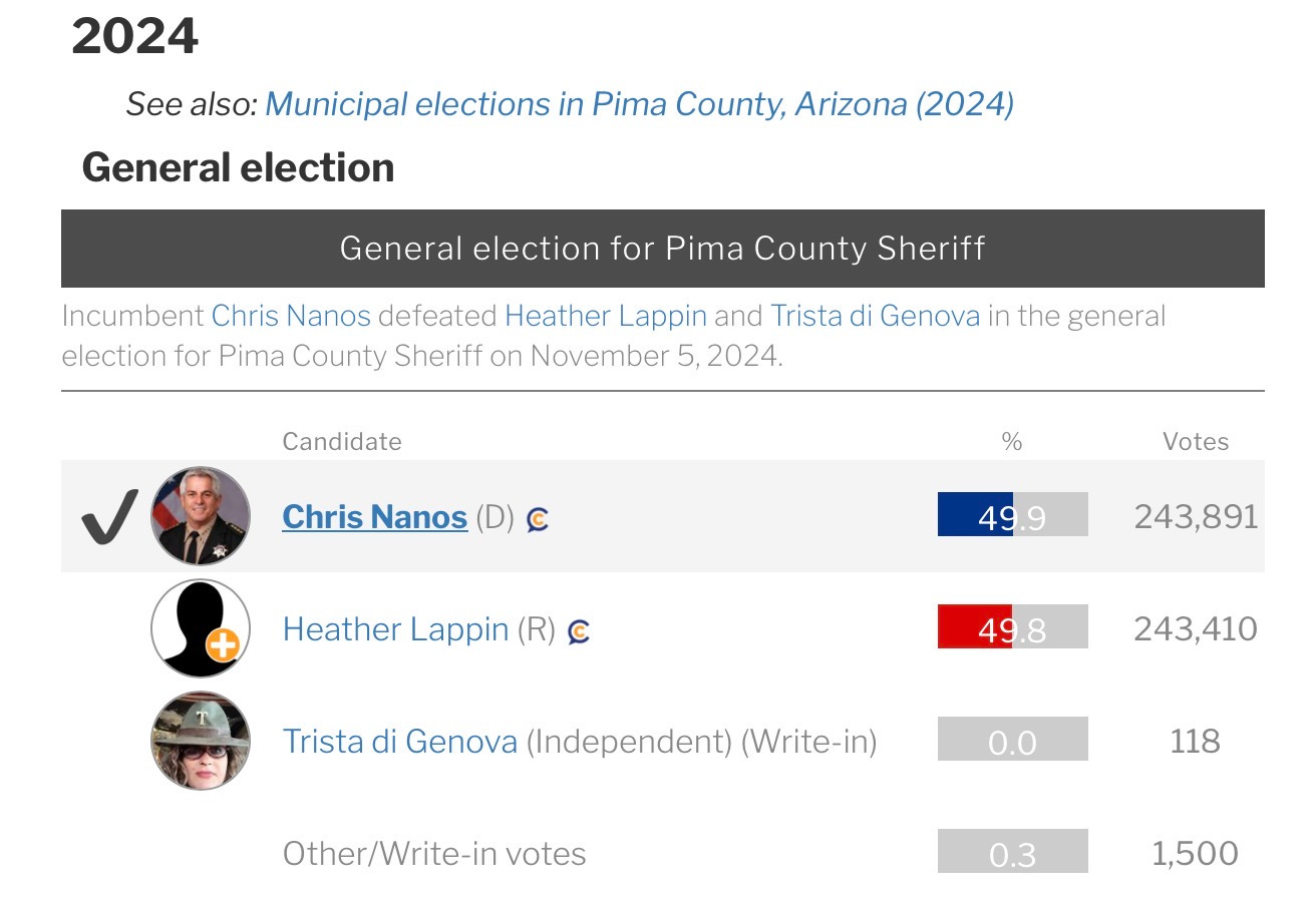 With nearly a half-million ballots counted, Heather came within 482 votes of becoming the first female sheriff in Arizona history. So much for progressivism, feminism, or whatever other isms leftists want to throw around. You may also connect the name Nanos to the pathetic efforts to find Nancy Guthrie, because it was the Pima County Sheriff’s Office on the job when the news first broke.