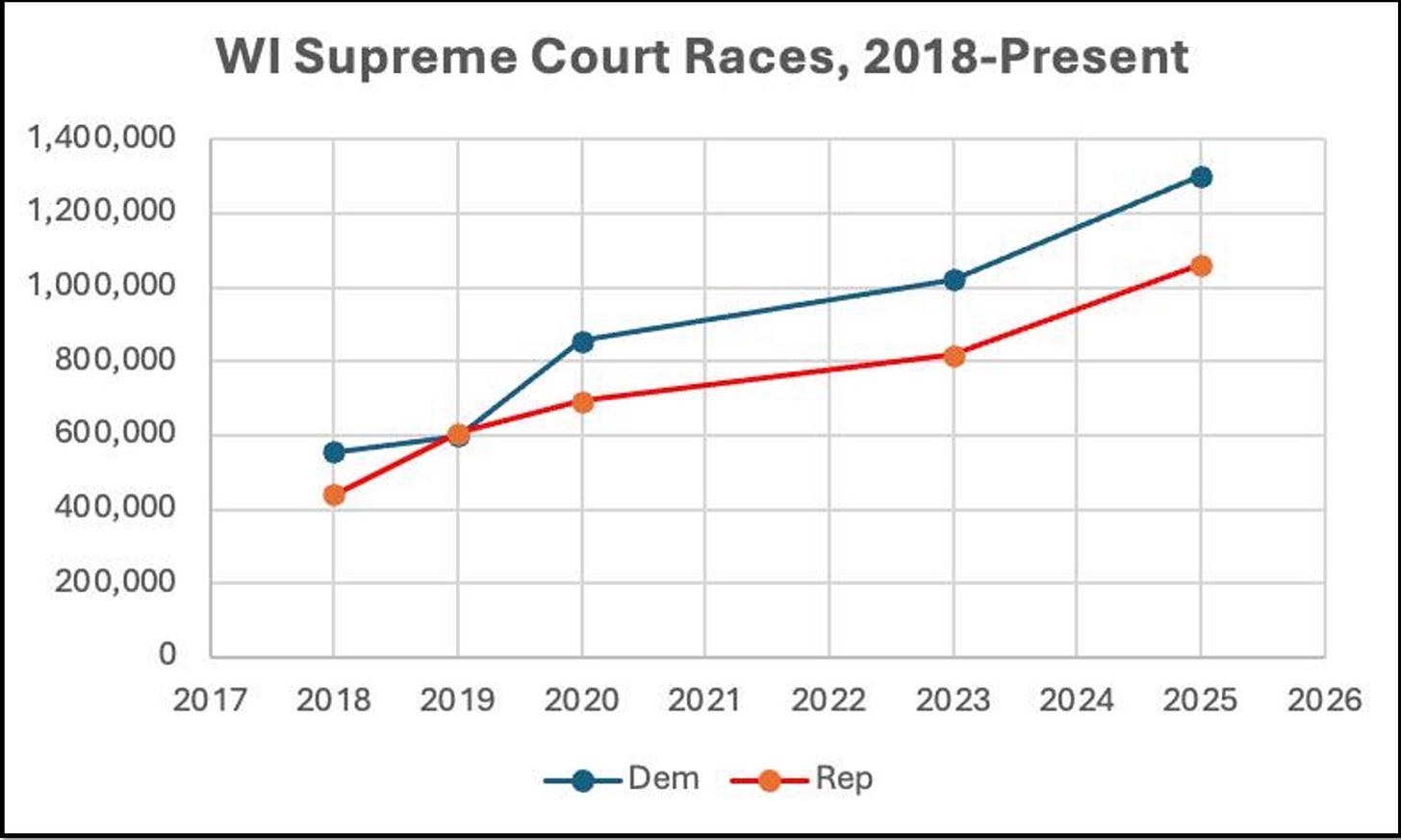 Yep, 600,000 votes for the Republican (technically non-partisan, but you know what I mean) candidate. That means she trailed Brad Schimel, who lost his race by 10 points last year, by over 460,000 votes. The Democrat candidate, Chris Taylor, would have lost to Schimel by over 8 points with her paltry 905,155 total, which is nearly 400,000 below Susan Crawford’s winning total in last year’s race.