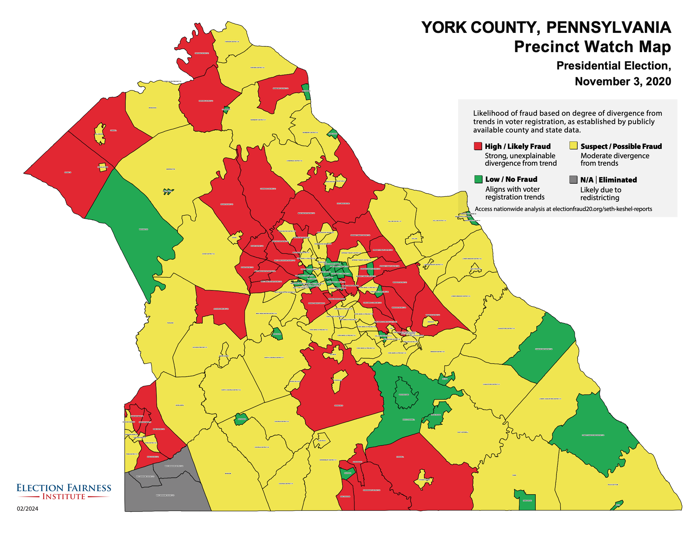 The York County precinct map shows 38 precincts in which I’ve estimated at least 125 or more fraudulent Biden votes. They are colored in red. Yellow precincts have likely mathematical indication of fraud, but likely less than 125 fraudulent ballots, and more than 50. If something is shown in green, it is classified low, and that is relative to the other precincts, not necessarily none.