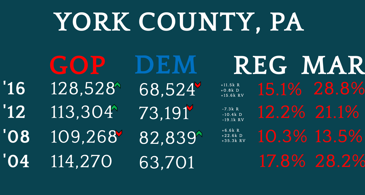 The trend leading into the 2020 election is heavily Republican, won by Trump by a higher margin than Romney, showing that York County is not an establishment Republican county backing away from Trump even from his first campaign. The county went left with the state in 2008 and showed a dip for McCain, but recovered margin over two cycles, and Trump exceeded Bush’s 2004 margin. The movement in the Republican registration advantage (“Reg” column in the graphic above) has correctly shown the direction of the margin as a predictor, even dating back before what is on the graphic. Democrat nominees are losing votes from Obama’s 2008 high point in two straight elections as Trump gains, and there is insufficient population growth to prevent that if Trump gains the same amount of net new votes in 2020. If Trump matches his previous gain, he will post 143,752 votes.