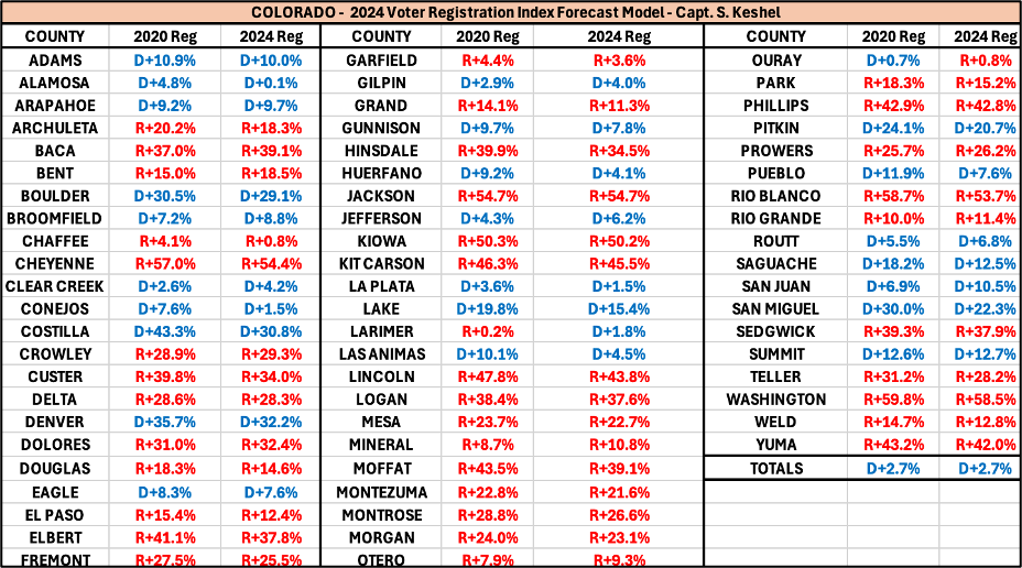 · Colorado from D+2.69% in 2020 to D+2.74% in 2024