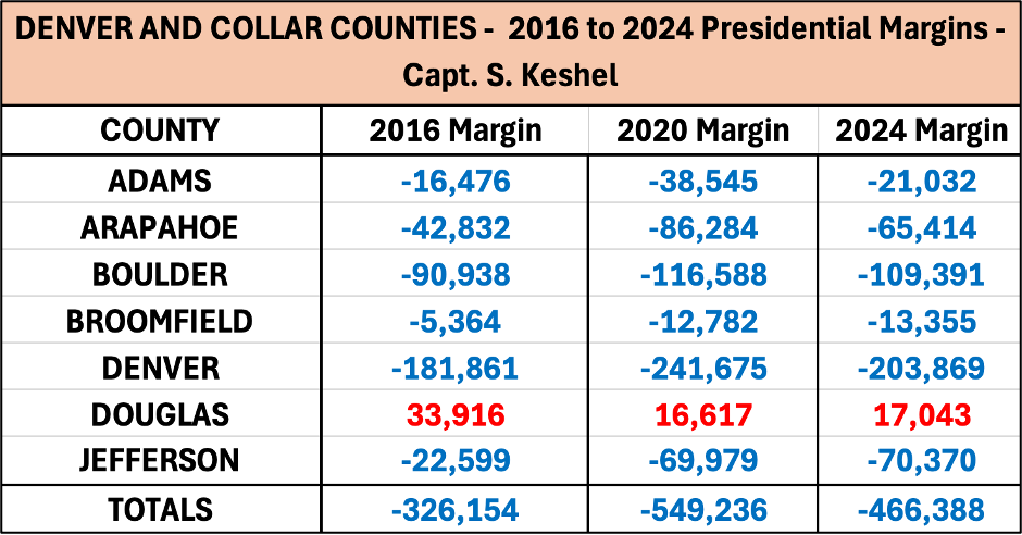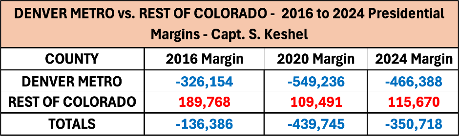 · Colorado statewide politics have been controlled by metro Denver, to include Boulder, since 2008. Only Douglas County within the metro area remains Republican-won, whereas Bush carried Arapahoe and Jefferson Counties in his 2004 win. See margins from metro Denver since 2016 below: